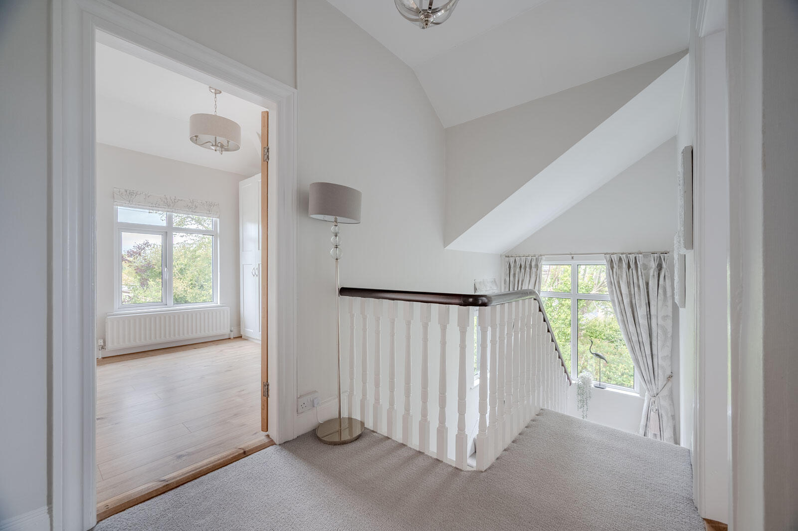 Upstairs, the home offers four well-proportioned bedrooms, each thoughtfully presented and benefitting from excellent natural light. Several rooms enjoy views stretching over Bangor Bay and towards the Copelands, further enhancing the sense of space. A beautifully appointed family bathroom combines period style with contemporary luxury, while a floored roofspace with Velux window, lighting and power adds welcome versatility and storage.