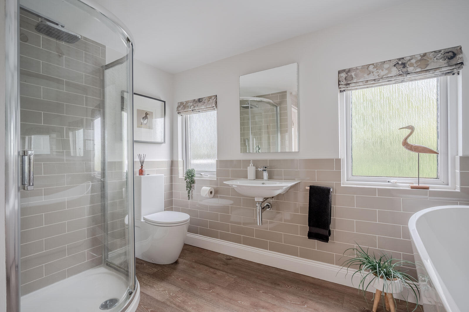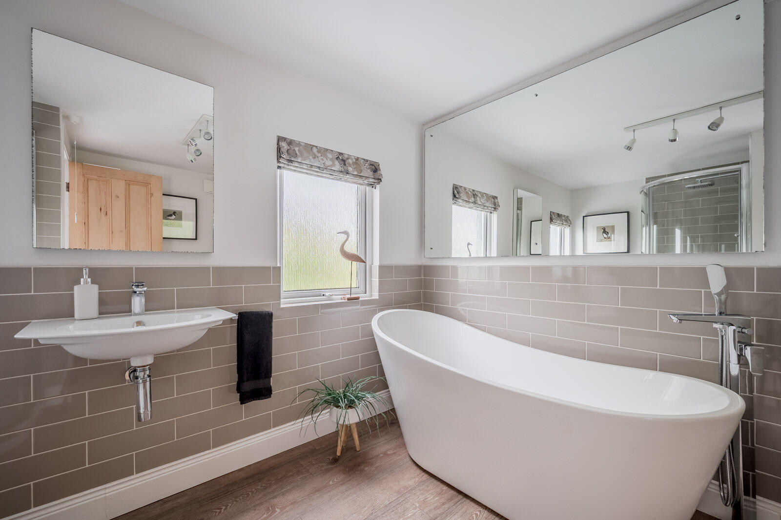 White suite comprising of low flush WC, wall hung wash hand basin, chrome mixer tap, free standing contemporary bath with free standing mixer tap with telephone handle attachment, partial subway style tiled walls, thermostatically controlled shower, telephone handle attachment, drencher above, sliding glazed shower screen, laminate wood effect floor, extractor fan and hotpress cupboard with Worcester gas fired boiler.