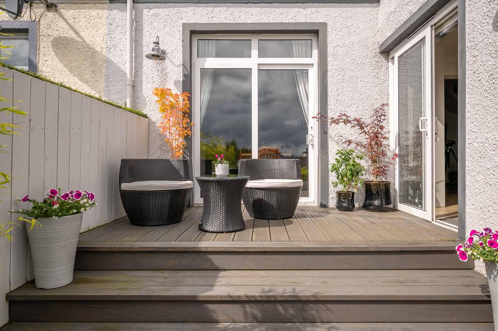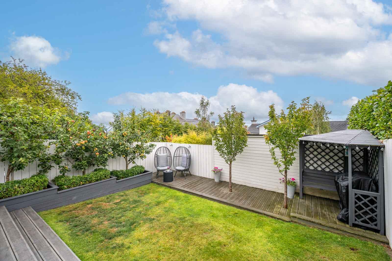 Private rear garden with raised decking, mature planting and multiple seating areas
