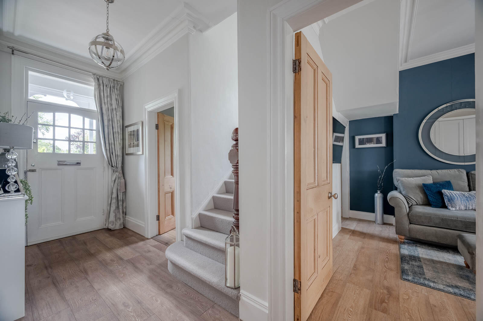 With feature porthole window and original glazed and hardwood front door through to reception hall.