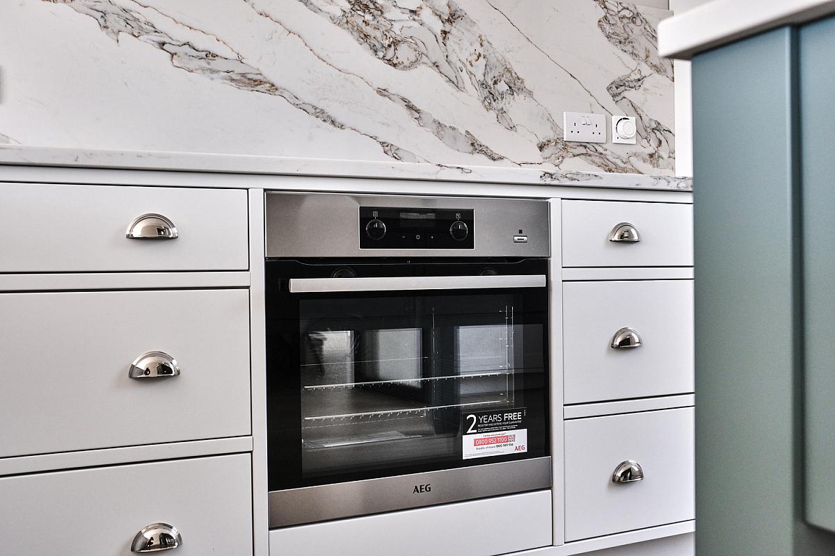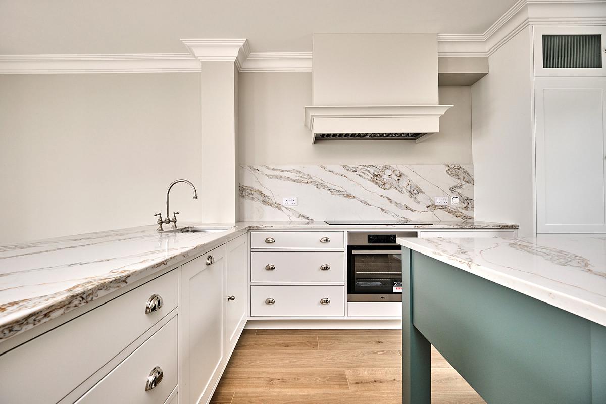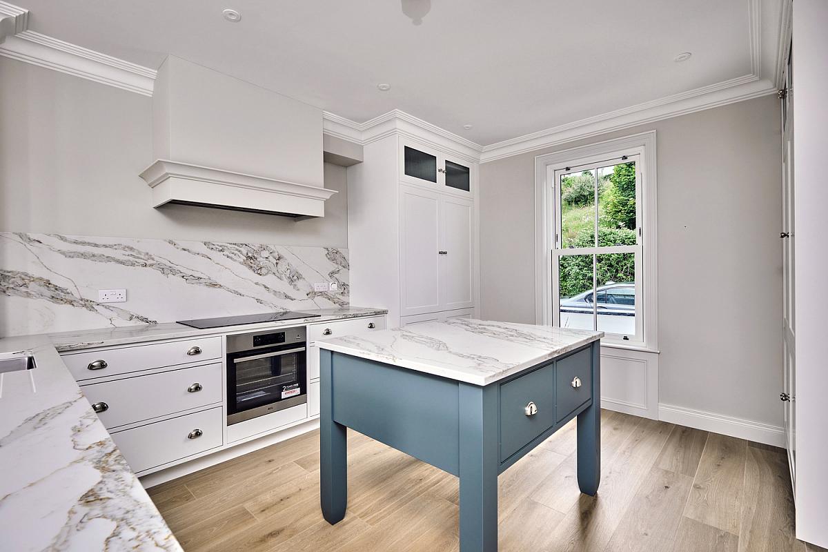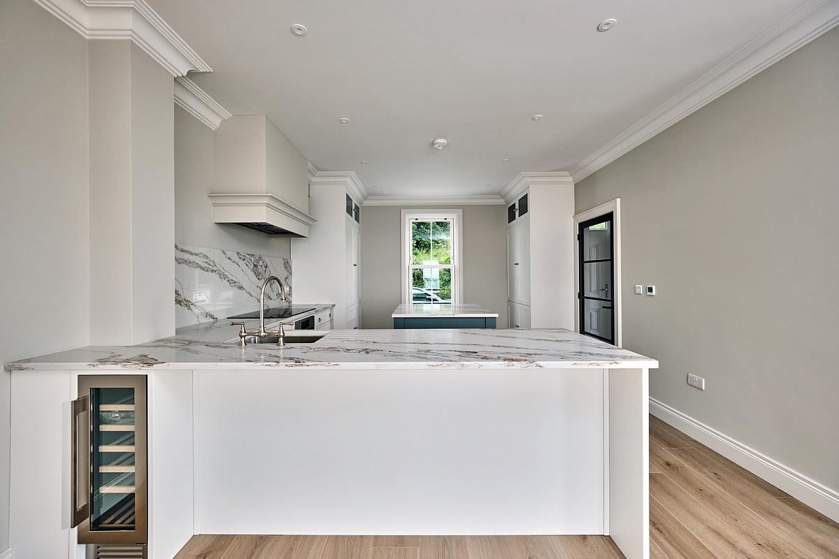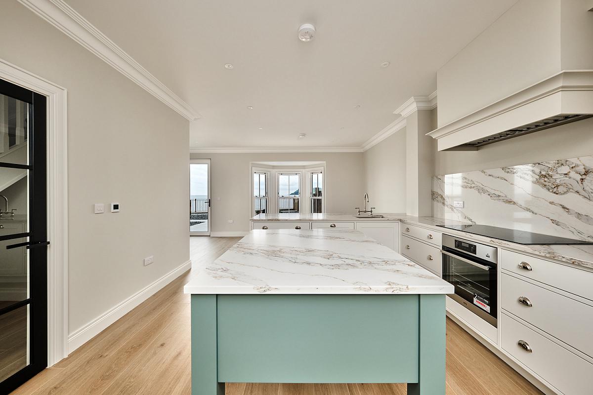 Bespoke handcrafted in-frame kitchen cabinetry finished in Little Greene paint with polished chrome handware, Lamont Sinquastone worktops and upstands, heritage polished nickel tap with undermount 'Abode' stainless steel sink unit, bespoke Plain English style island with breakfast bar seating, cabinetry including a pantry with Oak interior finishes, integrated Caple wine cooler, eye level AEG oven, integrated induction 5 ring hob with wood cooker hood canopy extractor fan, integrated washer and dryer, integrated fridge freezer and dishwasher, saucepan drawers, drawer banks, deep mouled skirting, architraves and cornicing, thermostat controls, feature Crittall style glazed door and PVC sliding doors leading to rear patio area with views across Carnlough Harbour, Antrim Coastline and Atlantic Ocean.