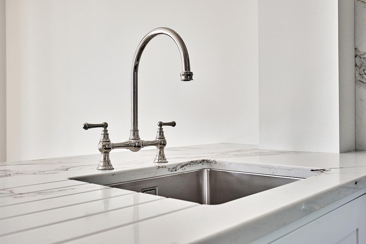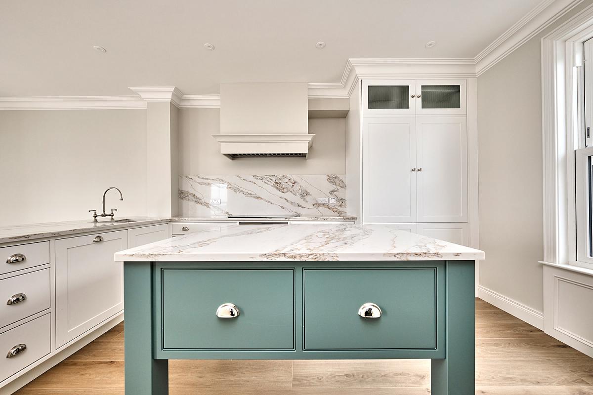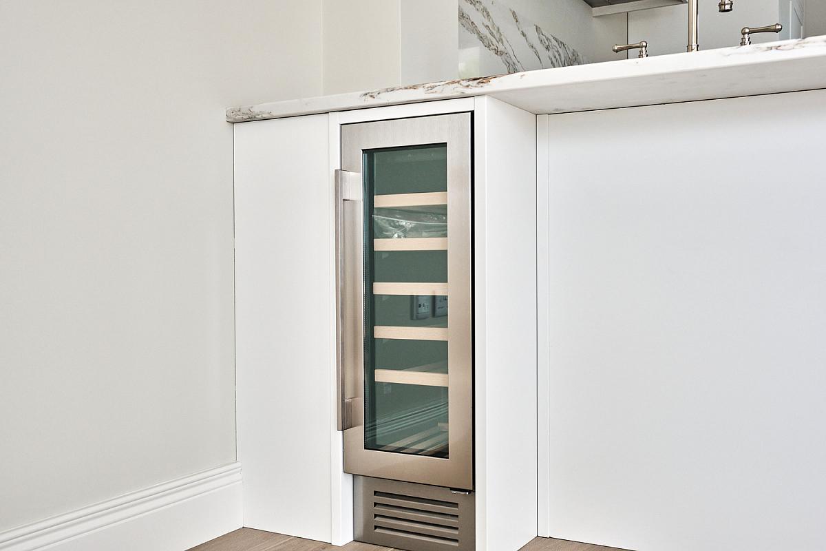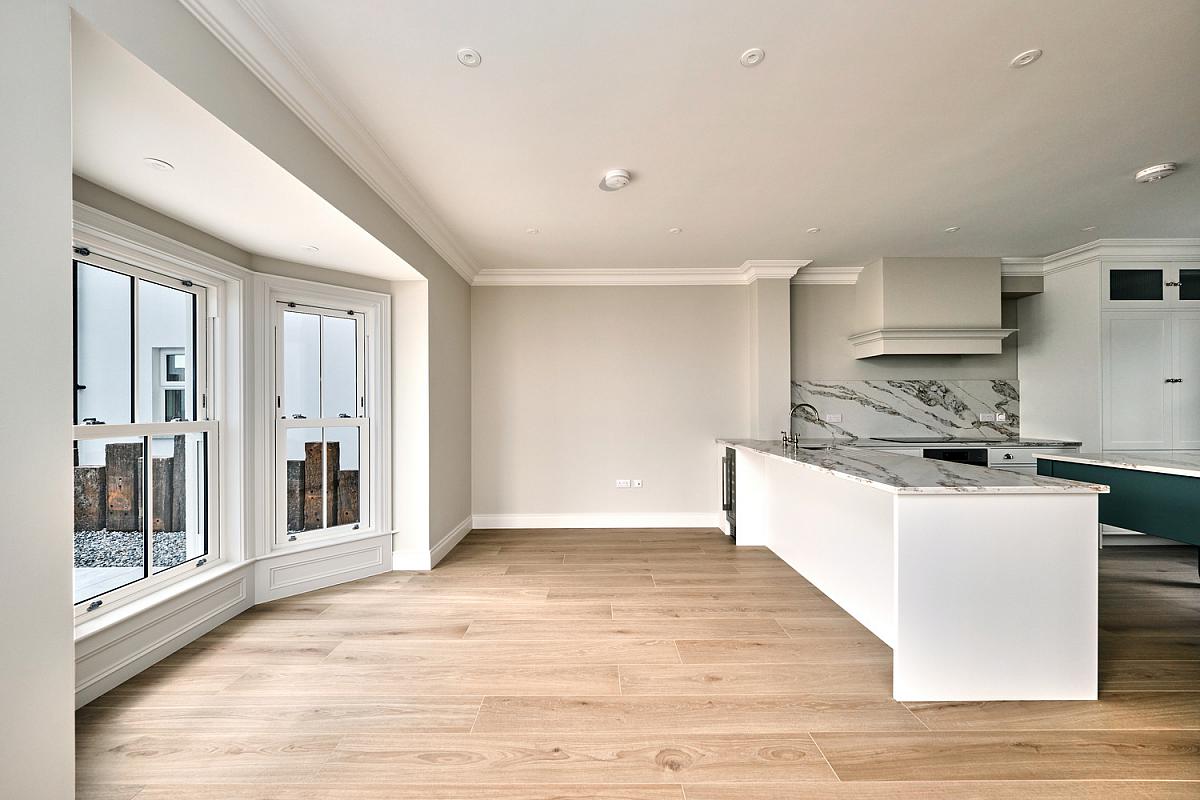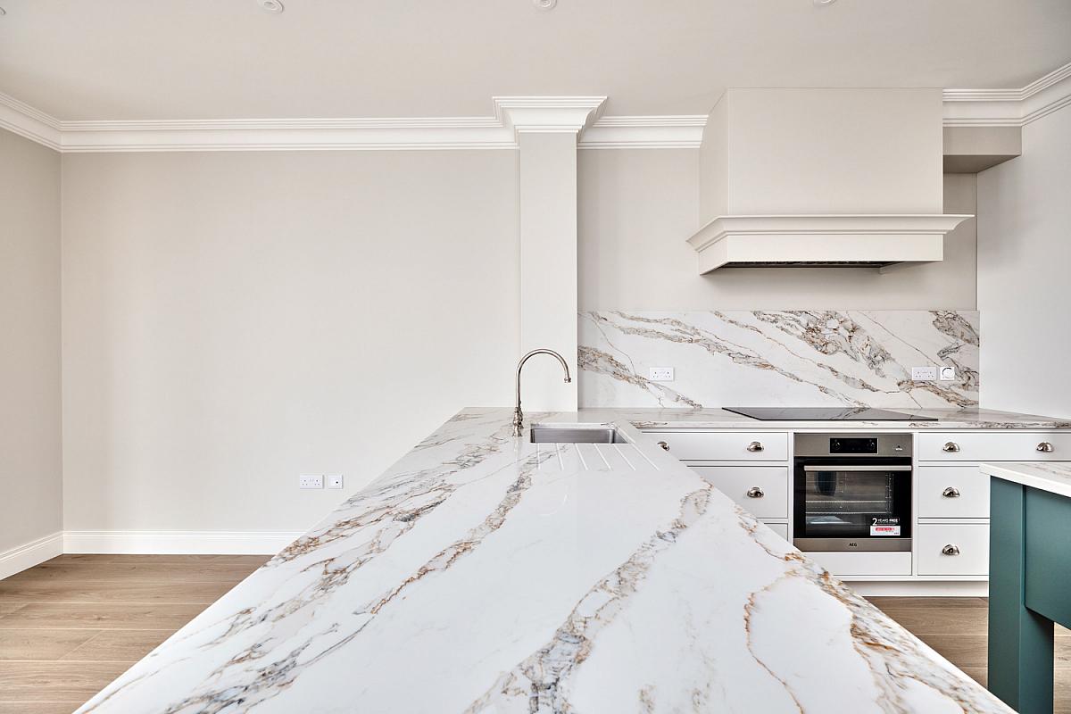 Bespoke handcrafted in-frame kitchen cabinetry finished in Little Greene paint with polished chrome handware, Lamont Sinquastone worktops and upstands, heritage polished nickel tap with undermount 'Abode' stainless steel sink unit, bespoke Plain English style island with breakfast bar seating, cabinetry including a pantry with Oak interior finishes, integrated Caple wine cooler, eye level AEG oven, integrated induction 5 ring hob with wood cooker hood canopy extractor fan, integrated washer and dryer, integrated fridge freezer and dishwasher, saucepan drawers, drawer banks, deep mouled skirting, architraves and cornicing, thermostat controls, feature Crittall style glazed door and PVC sliding doors leading to rear patio area with views across Carnlough Harbour, Antrim Coastline and Atlantic Ocean.
