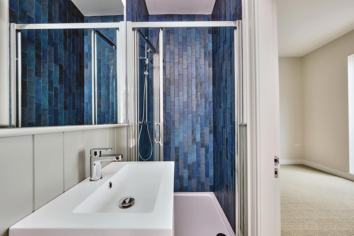 With w.c., wash hand basin with mixer tap, fully tiled walk in shower cubicle with rainfall shower, additional hand shower, part wood panelled walls, David Scott tiled throughout.