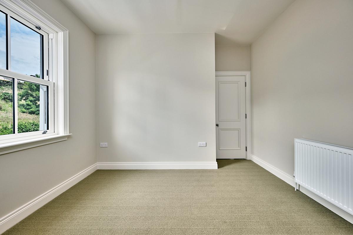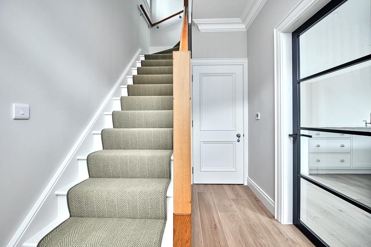 With thermostat controls, deep moulded skirtings, architraves and cornicing, recessed lighting and porcelain tiled floor (David Scott tiles) Stitched herringbone weave carpet on stairs.
