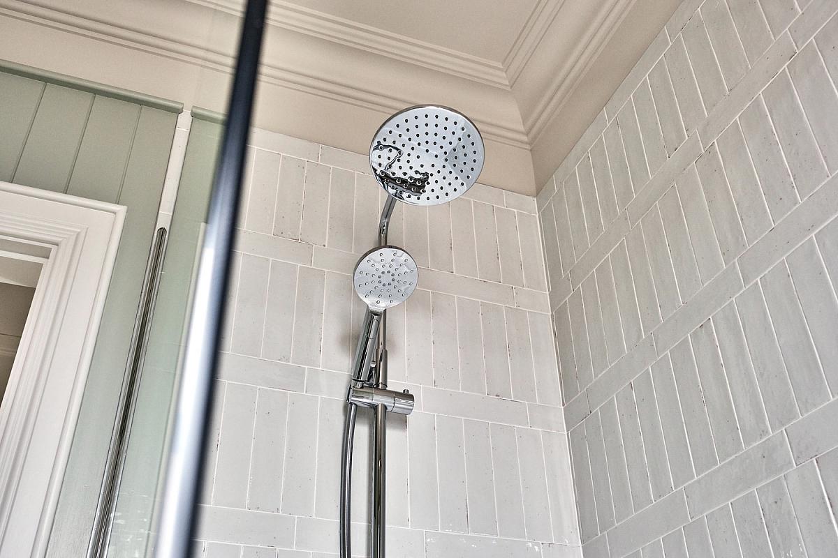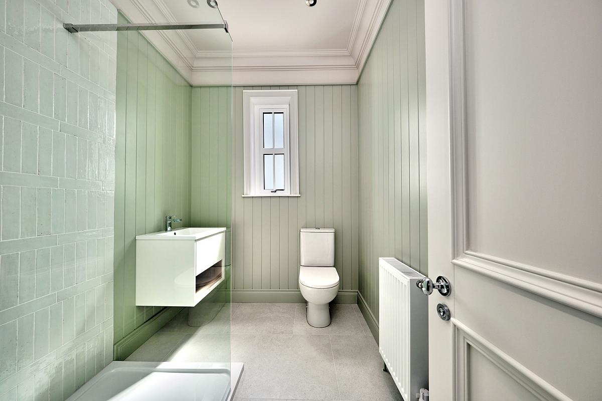With w.c., wash hand basin set in floating vanity unit with mixer tap and storage below, fully tiled walk in shower cubicle with low profile shower tray, Rainfall shower fitting with additional hand held shower, deep moulding cornicing, wood panelled walls, and porcelain tiled floor (David Scott tiles).