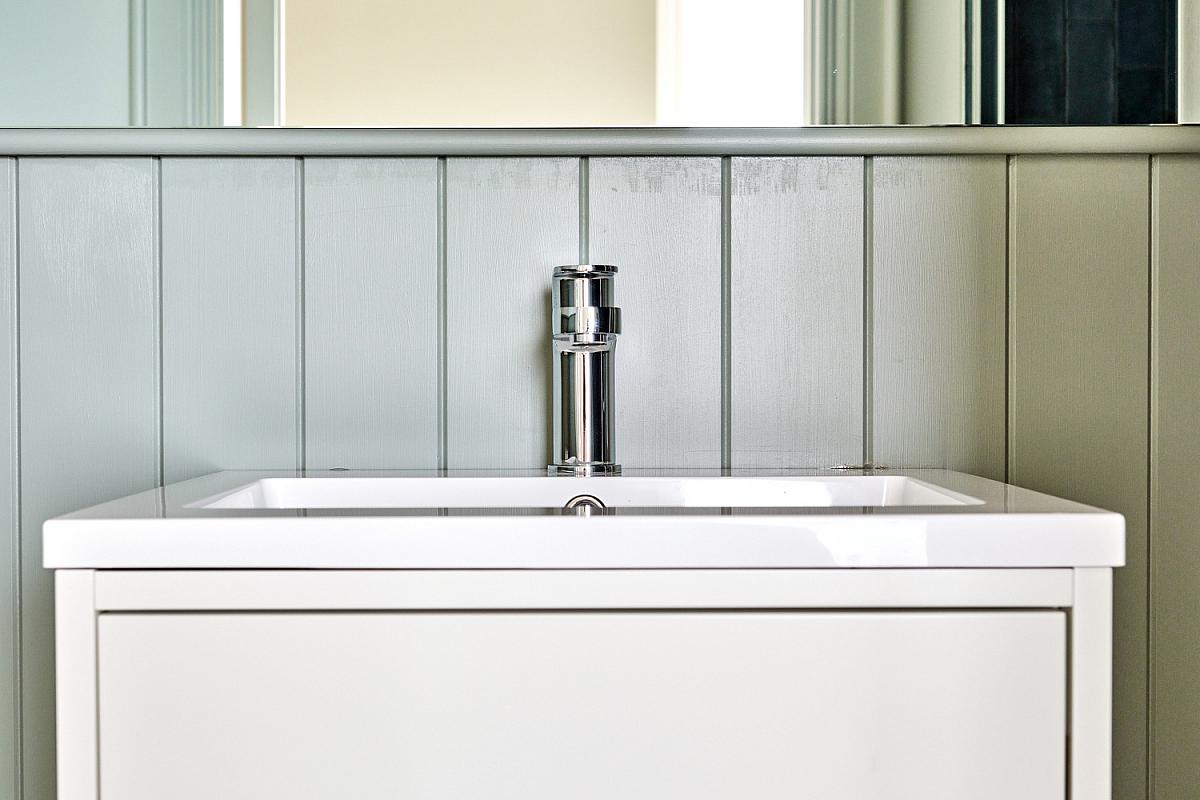 With w.c., wash hand basin, full wall fitted mirror, half wood panels and porcelain tiled floor (David Scott tiles).