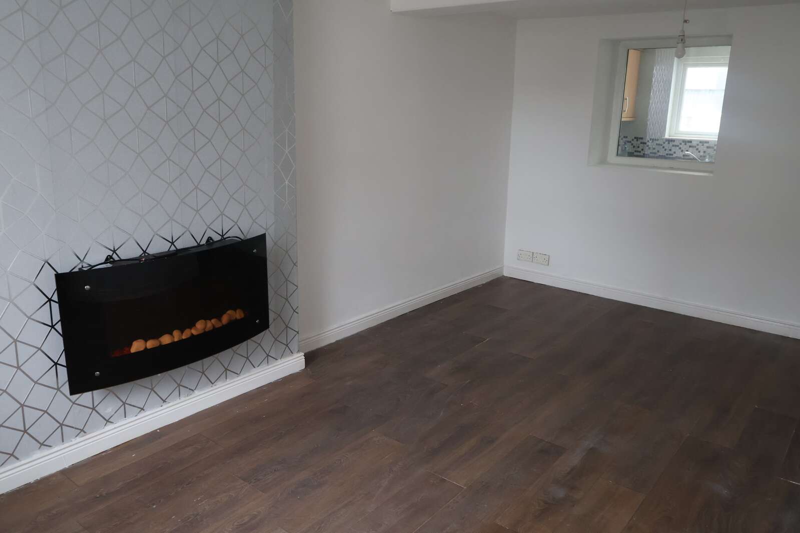 LIVING ROOM: 5.2m x 2.6m laminated wood floor, flame effect electric fire and under-stair storage.
