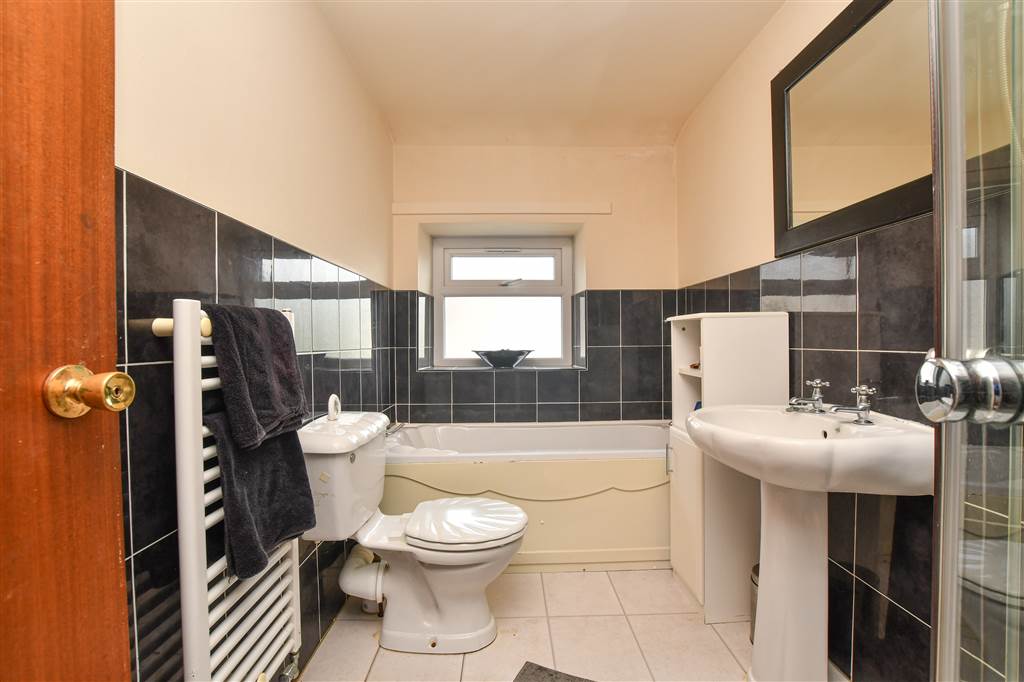 Modern white bathroom suite incorporating W.C., pedestal wash hand basin and panelled bath. Separate shower cubicle. Part wall tiling.