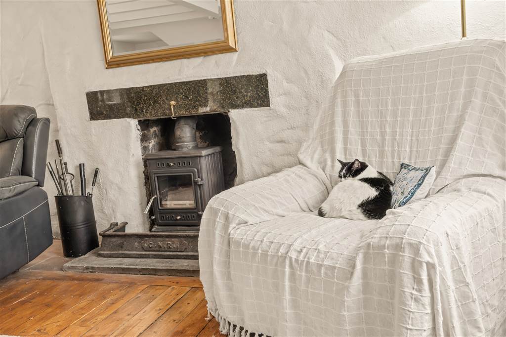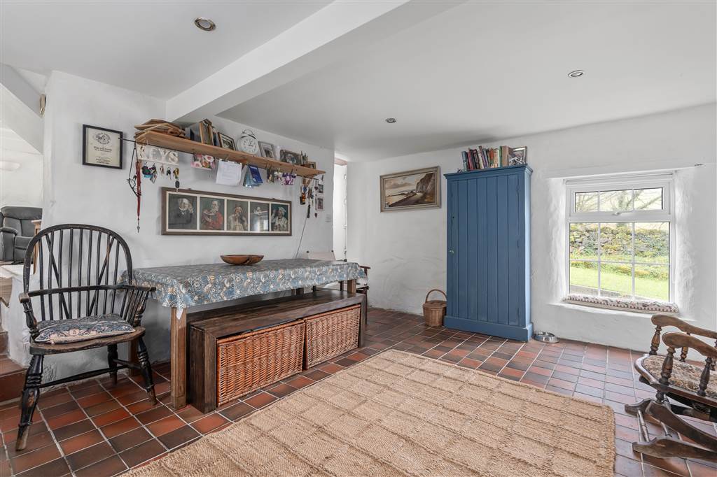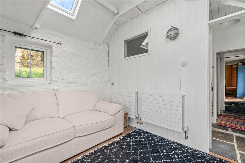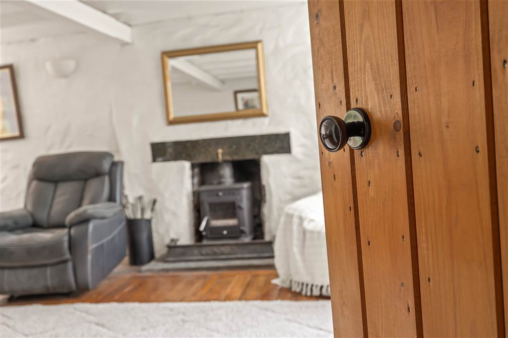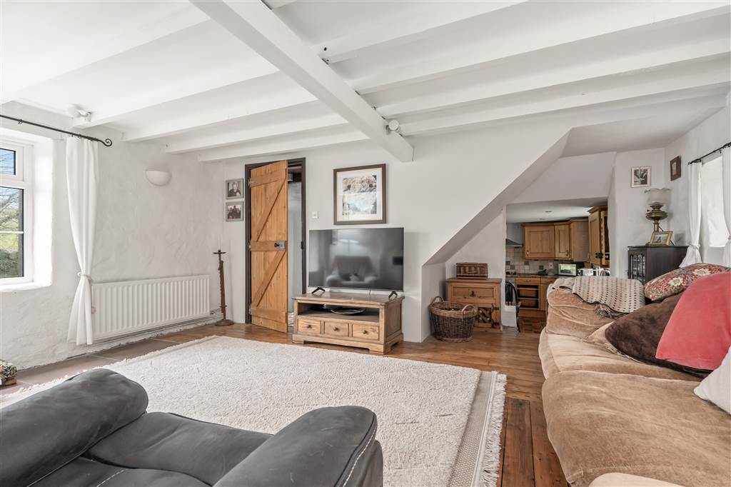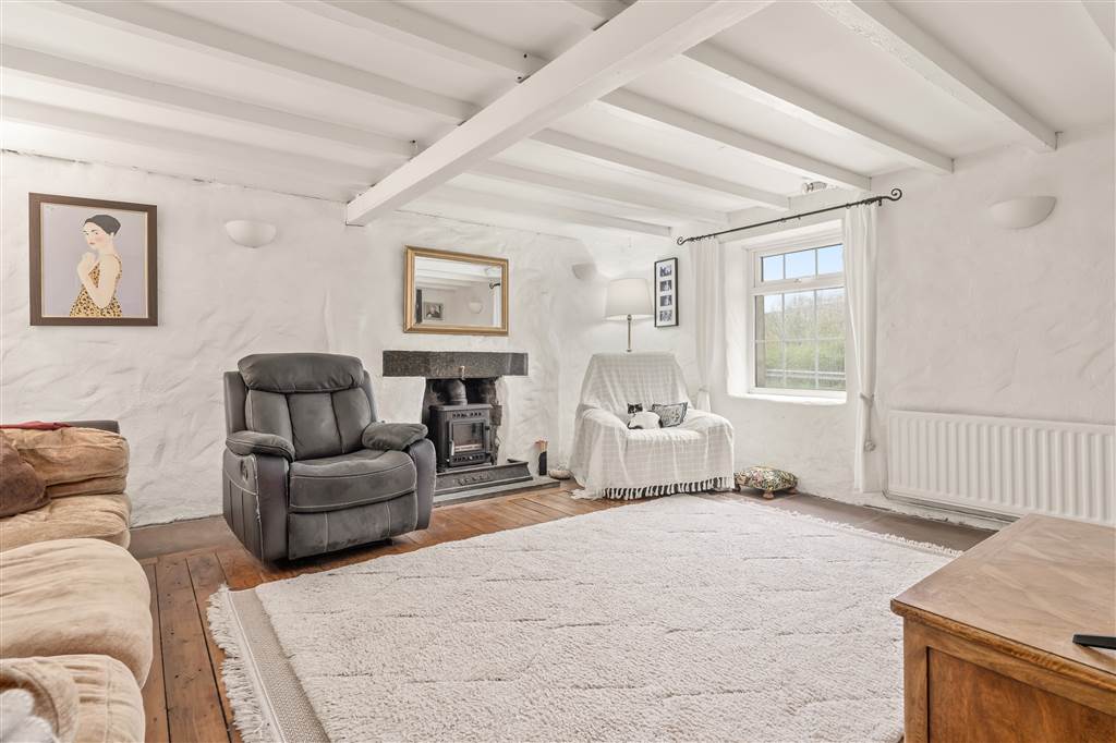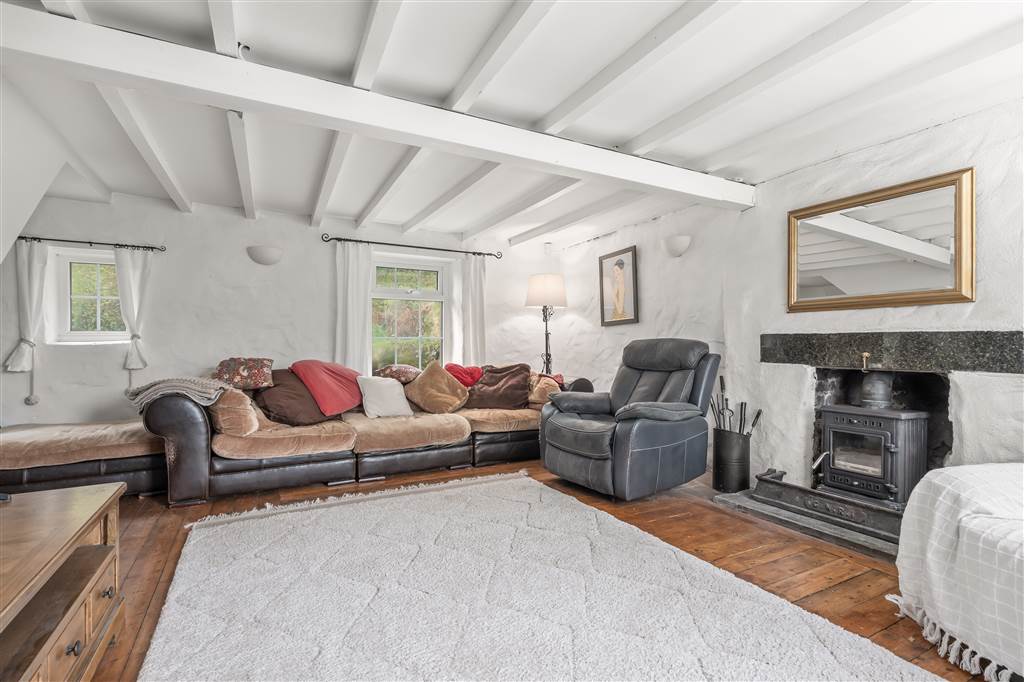 With multi-fuel burning stove to slate hearth. Wall lights. Wooden beams to ceiling. Solid wooden flooring. Steps leading down to kitchen.