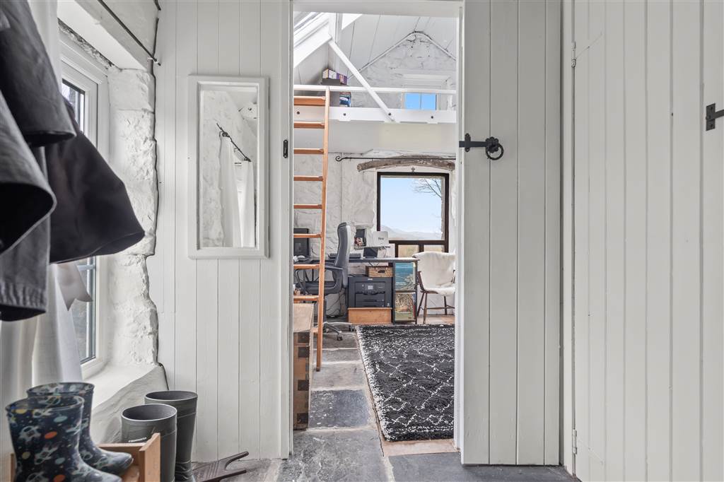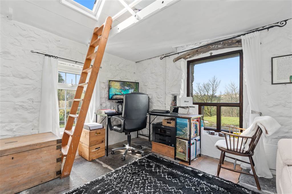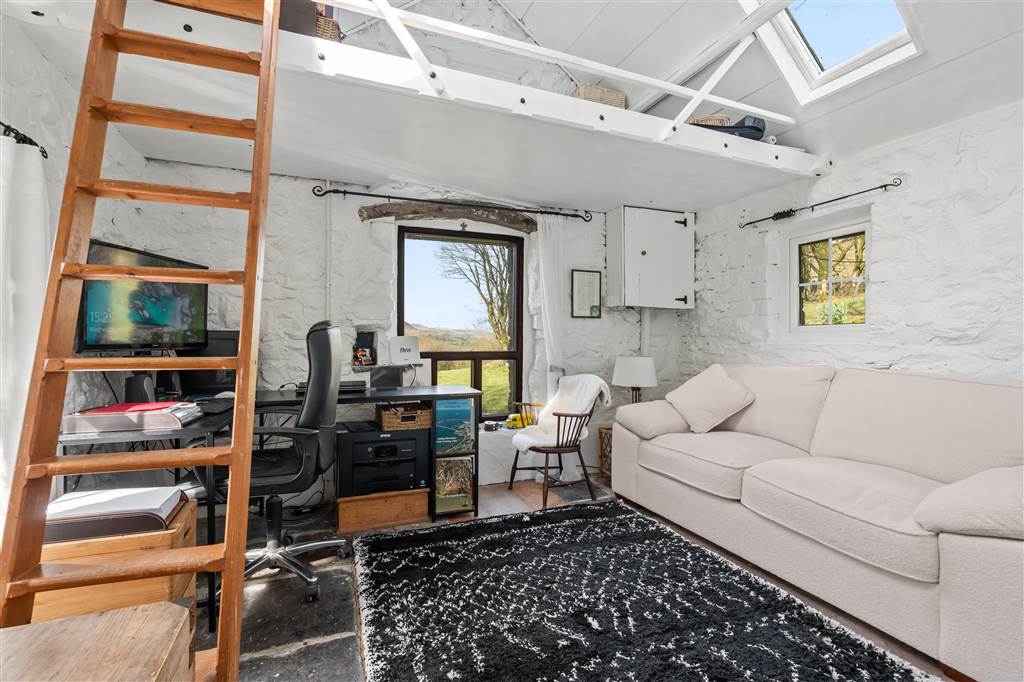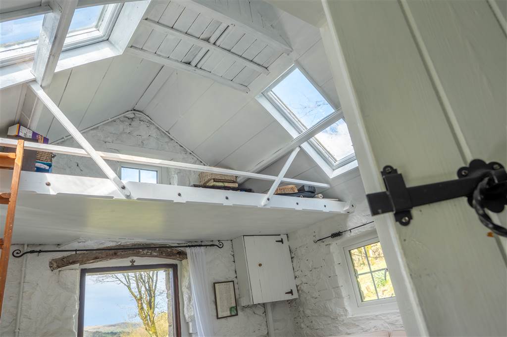 Mezzanine loft area accessed via ladder, suitable for storage, occasional use, reading nook or extra bunk. Stunning views over the surrounding countryside. Fixed skylights. Wall light. Wooden panelling to wall. Natural stone flooring