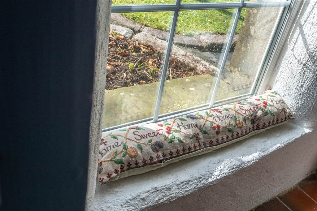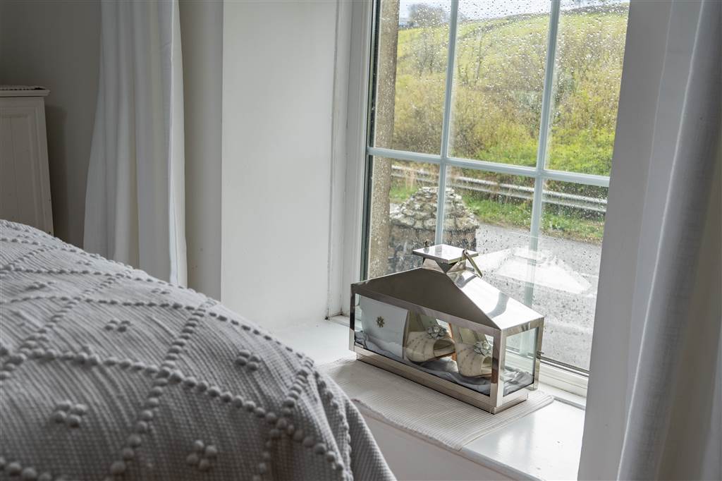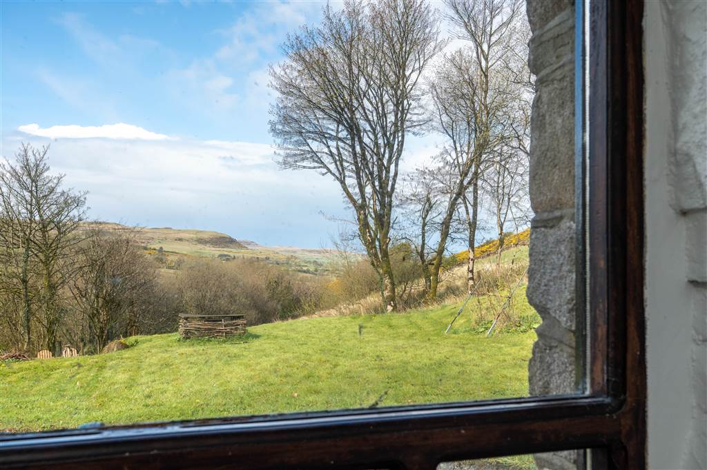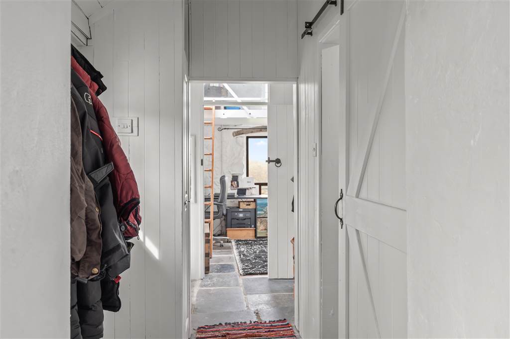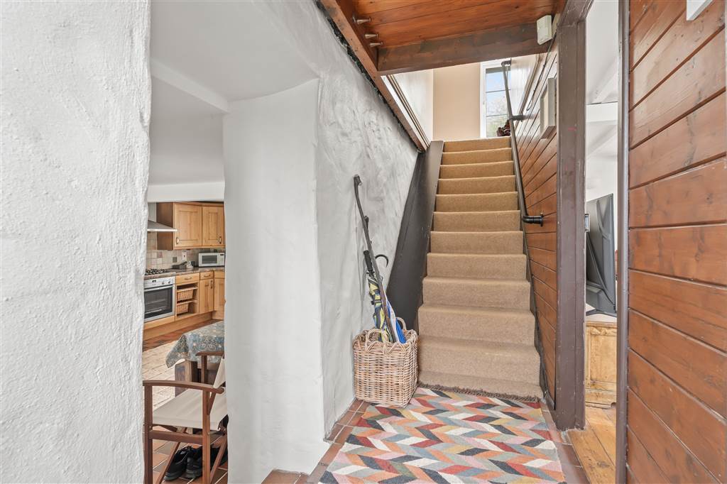 Mezzanine loft area accessed via ladder, suitable for storage, occasional use, reading nook or extra bunk. Stunning views over the surrounding countryside. Fixed skylights. Wall light. Wooden panelling to wall. Natural stone flooring