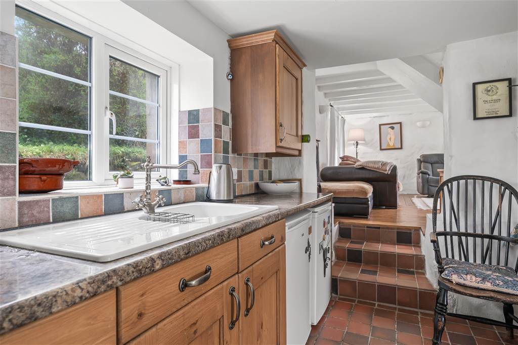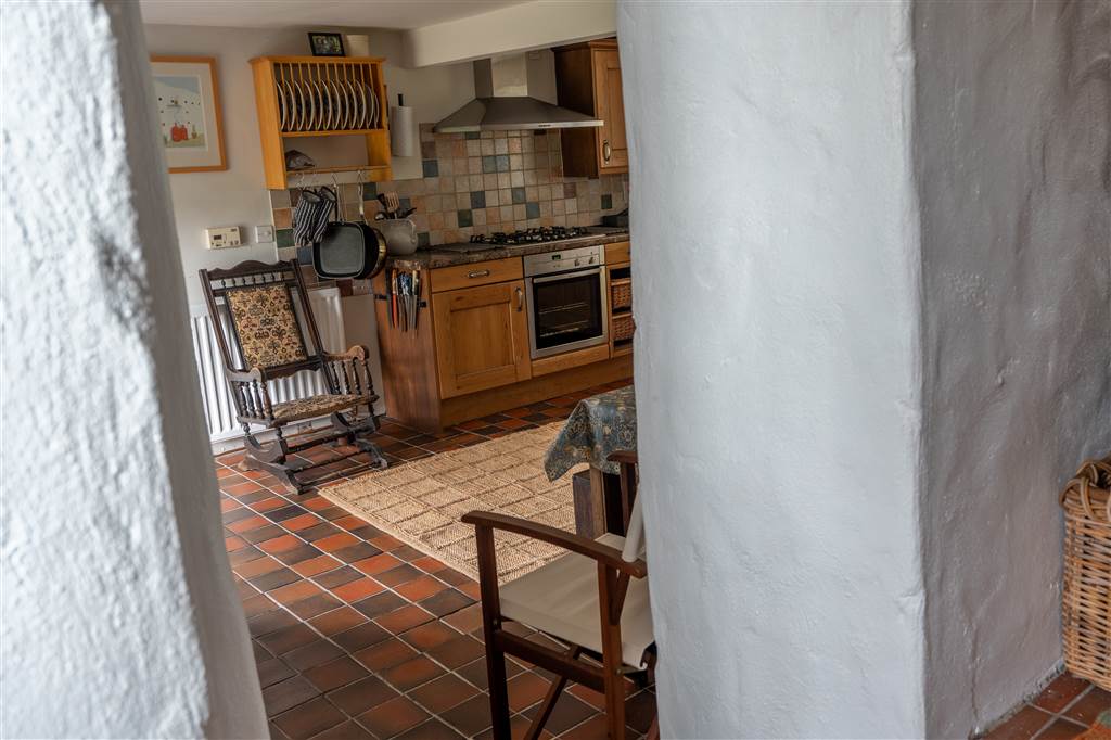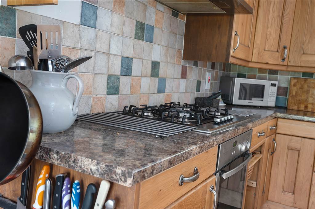 With a range of eye and low-level fitted units, 1 1/4 bowl sink unit and drainer with mixer tap. Integrated four ring gas hob with stainless-steel extractor fan over. Integrated oven. Space for under counter fridge-freezer. Cutlery drawers. Saucepan drawers. Spacious area for dining. Spot lighting to ceiling. Splash back tiling. Tiled flooring.