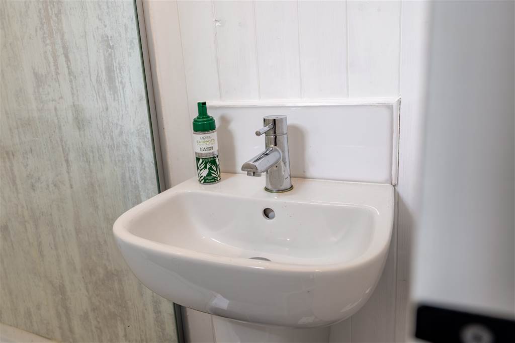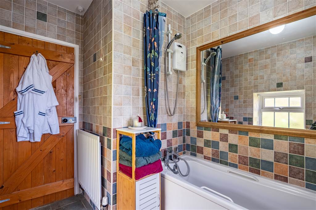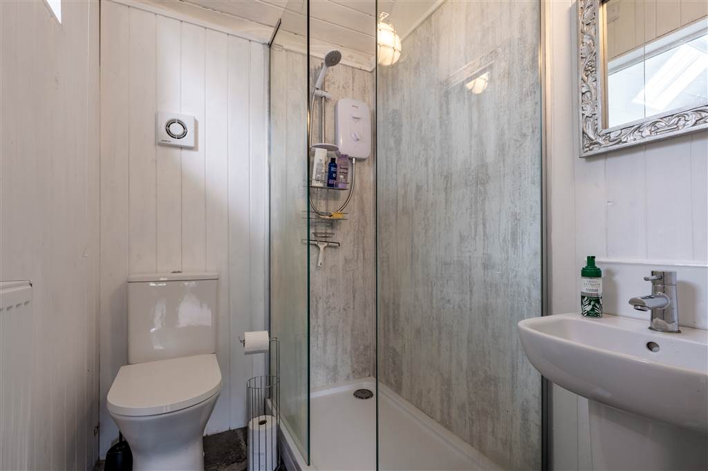 With 3-piece white suite comprising LFWC, WHB and shower to corner cubicle. Wall light. Wooden panelling to walls. Splash back tiling. Natural stone flooring.