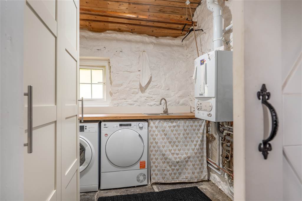With tall storage units, stainless-steel sink unit and drainer with stainless-steel mixer tap. Plumbed for washing machine. Space for tumble dryer. Natural stone flooring.