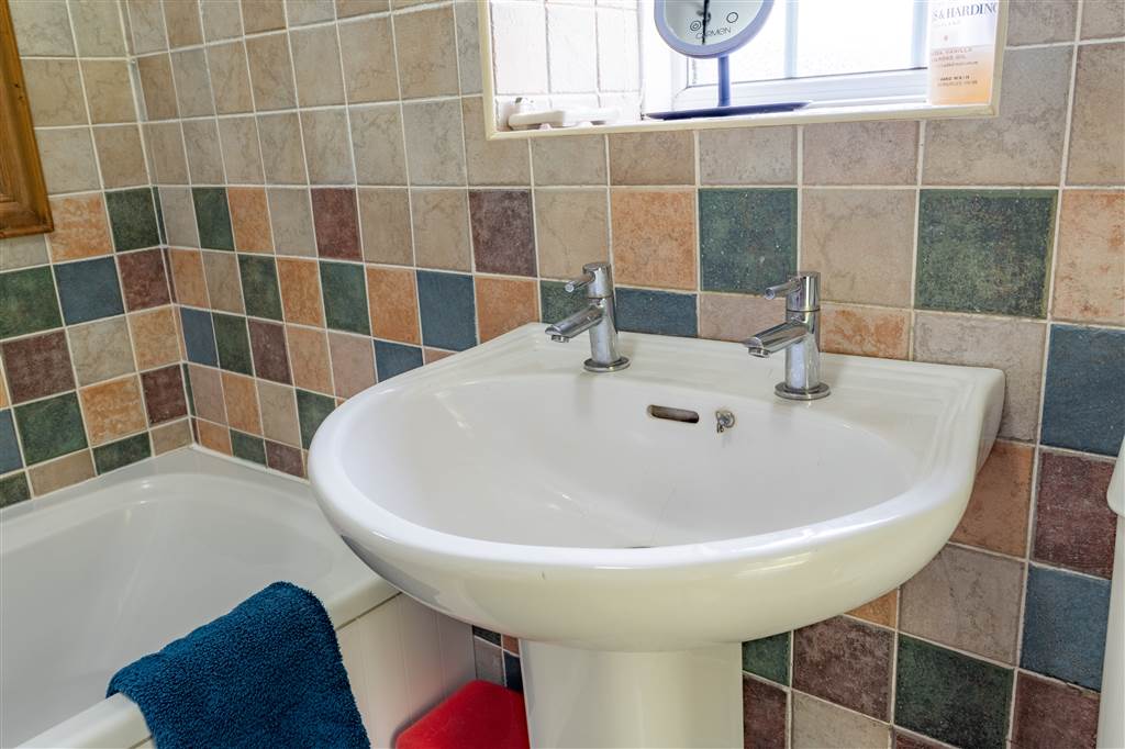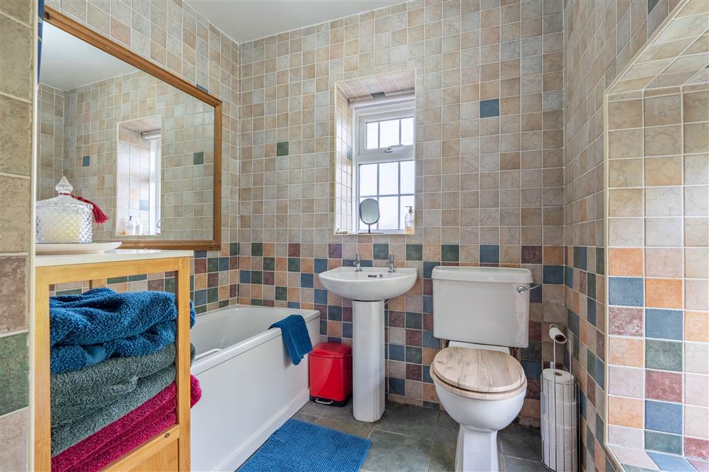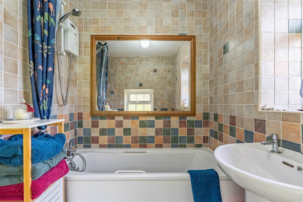 With 3-piece white suite comprising LFWC, WHB and panelled bath with shower over. Tiled walls. Tiled flooring.
