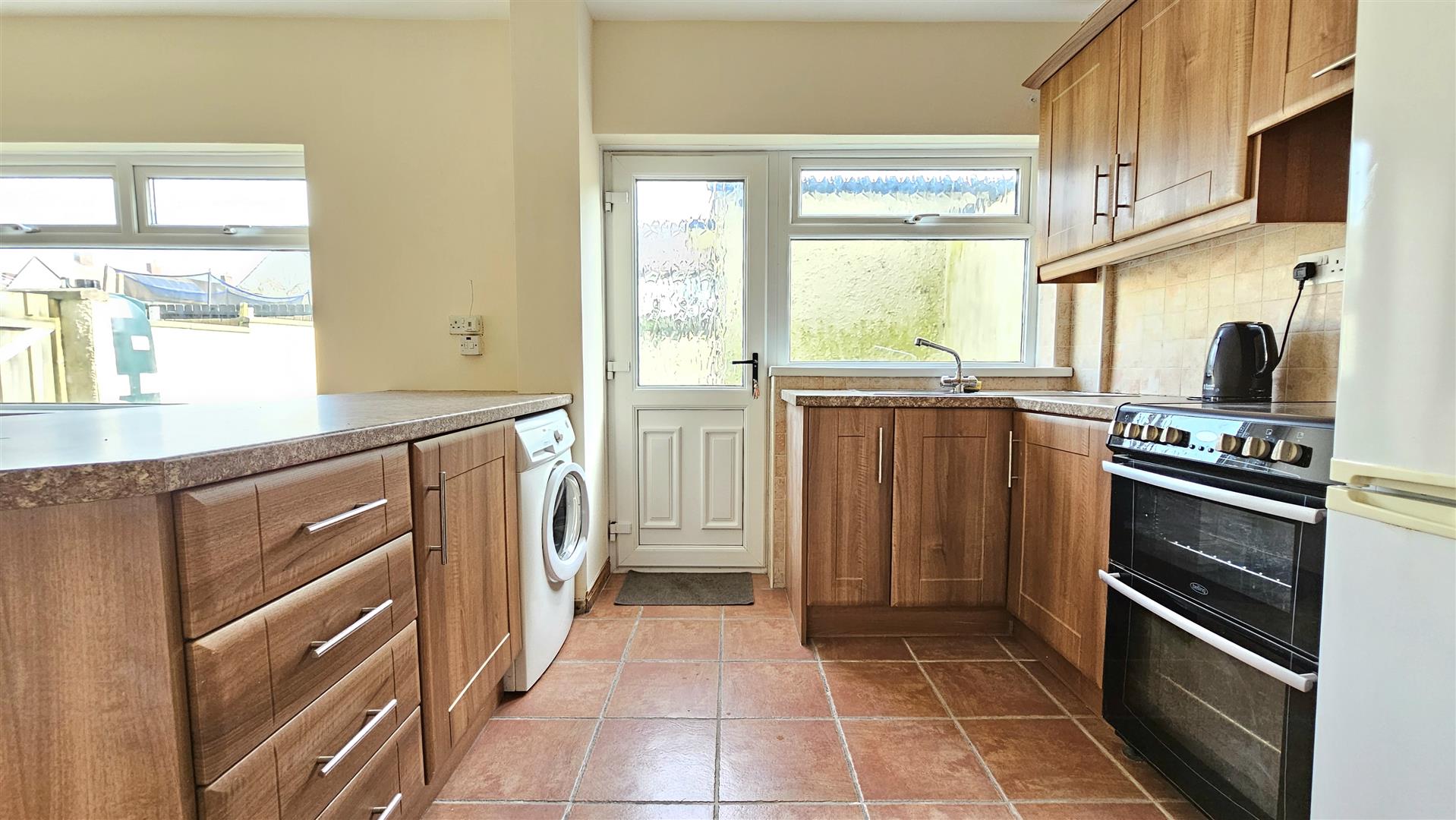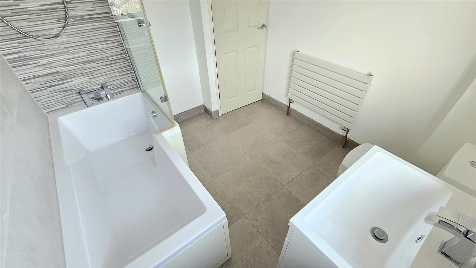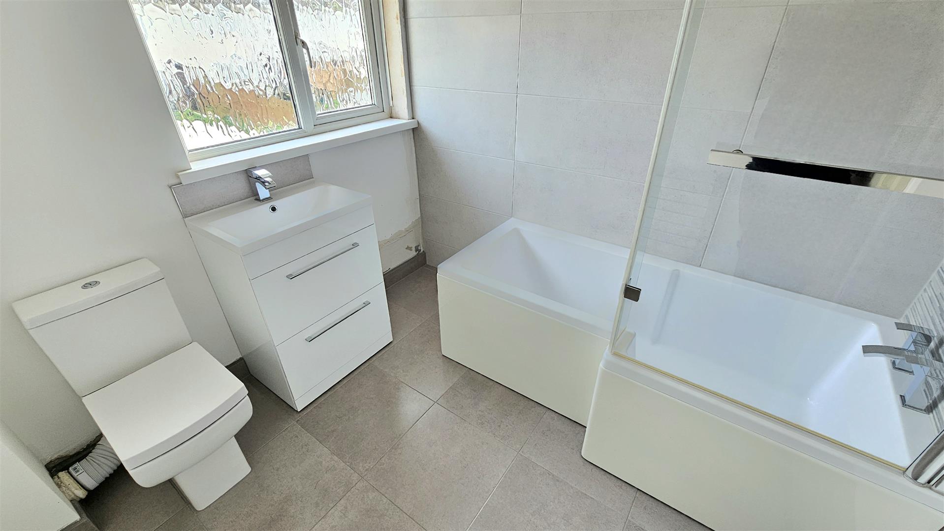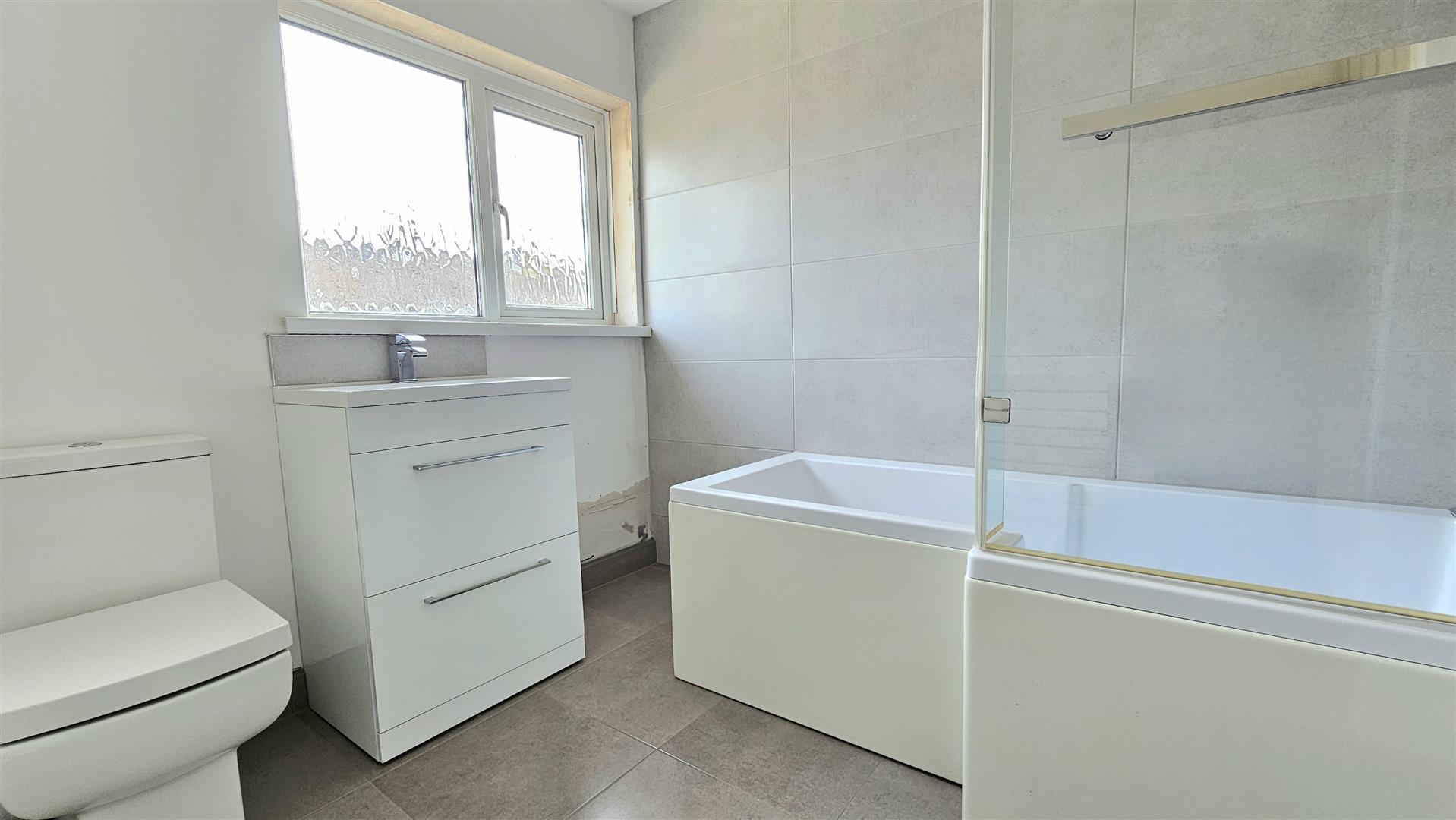The bathroom has been updated in a modern style and incorporates a contemporary white suite including an L-shaped shower bath and a sink set on a vanity unit, complemented by modern tiling. Additional features include double glazed windows in PVC frames and an oil fired heating system with an updated boiler. Outside, the property benefits from an enclosed rear garden, and with no ongoing chain, a straightforward purchase may be possible.