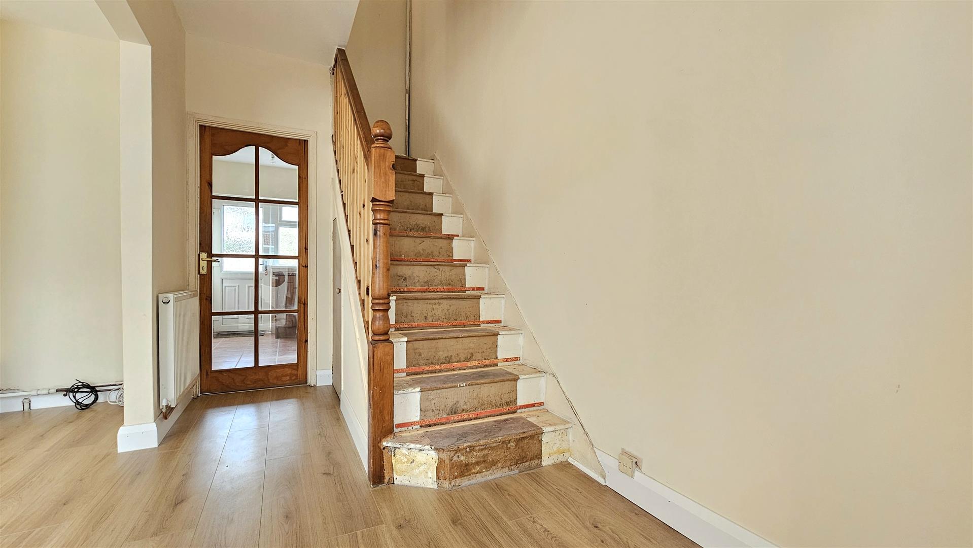 Matching laminate wood flooring through entrance hall, lounge and dining area