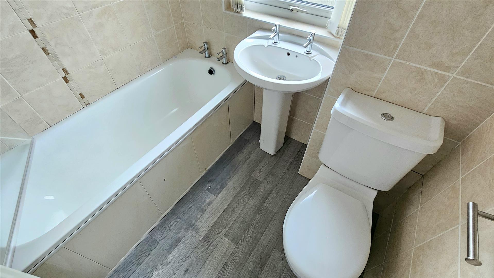 Double glazed window to rear aspect, white suite comprising low flush Wc, pedestal sink, enclosed bath with shower over, fully tiled walls