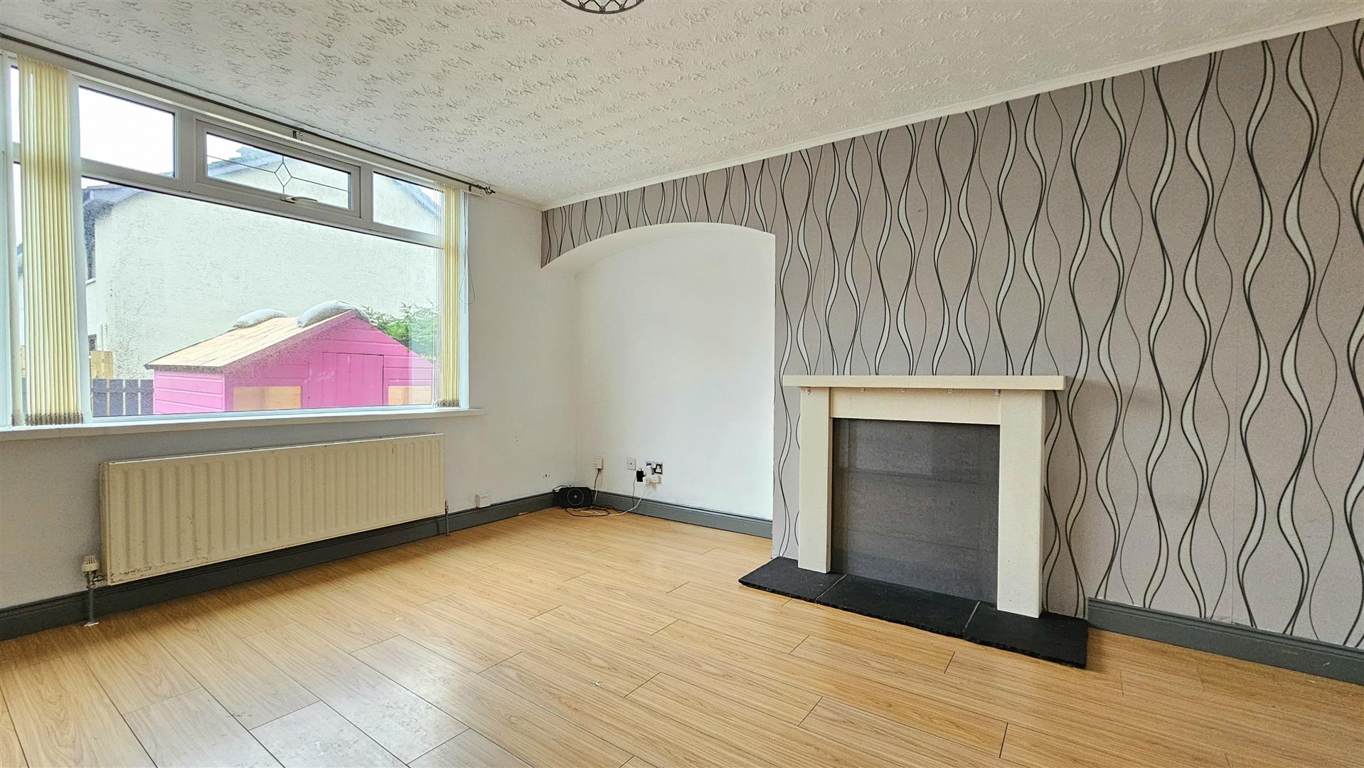 Double glazed window to front aspect, feature fire place with wood surround & tiled hearth, radiator, laminate wood floor
