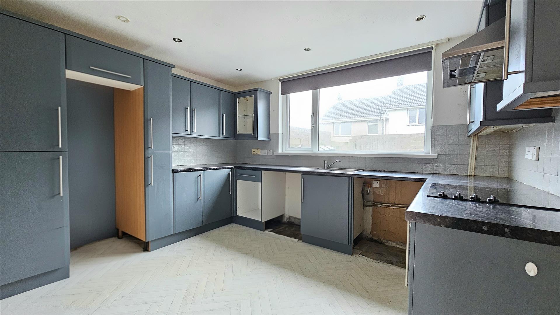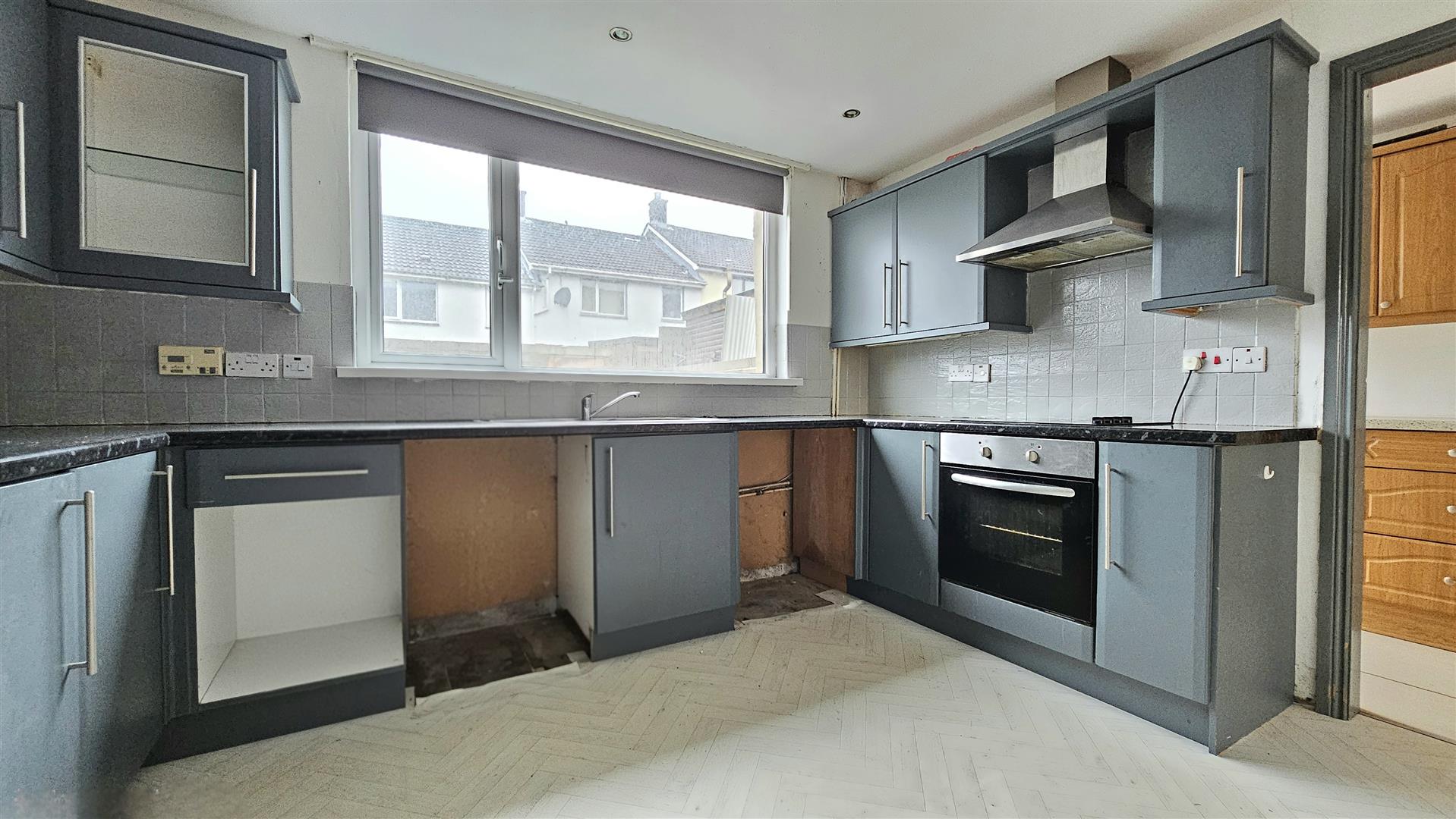 Kitchen incorporates a range of grey units, built in oven, hob and extractor