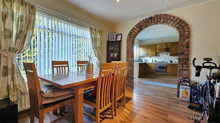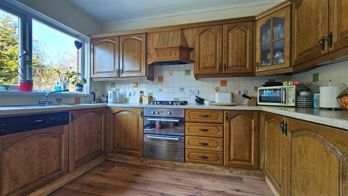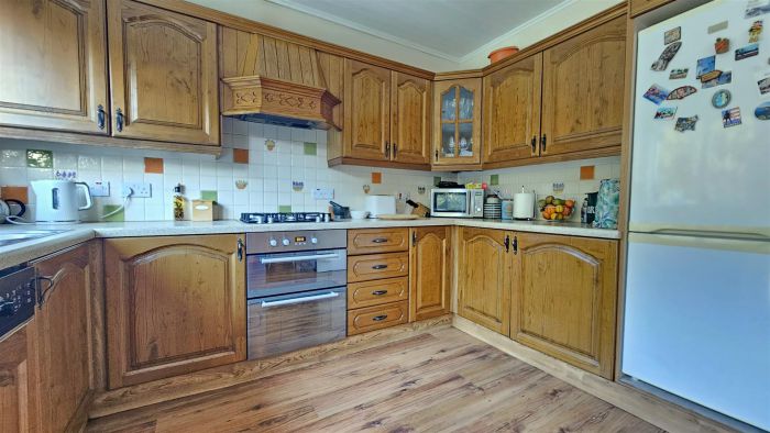 Double glazed window and door to rear aspect, range of Oak high and low level units with roll worktops, inset 1.5 bowl sink and drainer with mixer tap over. Built in stainless steel double oven and 4 ring gas hob with extractor fan over, integrated dishwasher, radiator, laminate wood flooring.