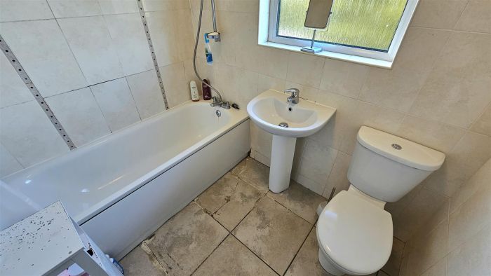 Double glazed window to rear aspect, white bathroom suite comprising low flush W.c. pedestal sink sink and panel enclosed bath with shower over, radiator