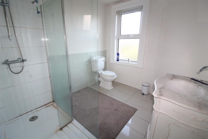 Double glazed window to rear aspect, white suite comprising low flush WC, wash hand basin, shower cubicle, ceramic tiled floor