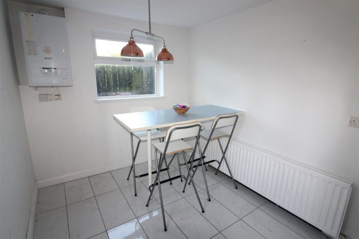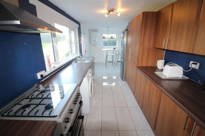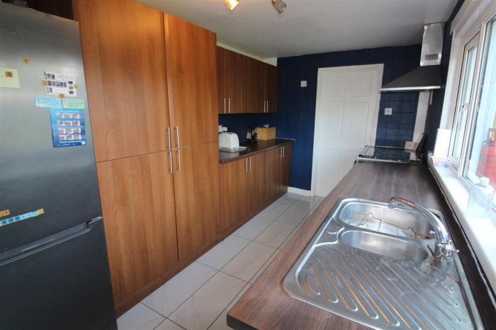 Double glazed window to rear and side aspect, range of Walnut style high and low level units with roll edge worktops, inset 1.5 bowl stainless steel sink and drainer with mixer tap over, stainless steel chimney style extractor fan, plumbed for washing machine, radiator, ceramic tiled floor, door to rear garden