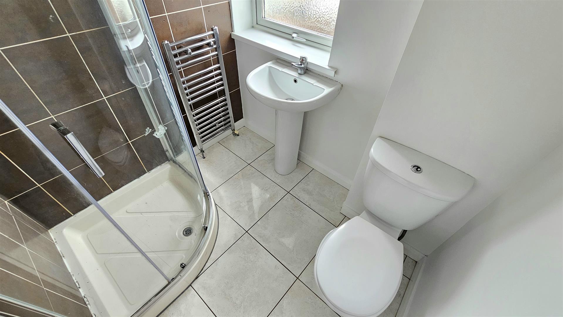 Double glazed window to rear aspect, white suite comprising low flush Wc, pedestal sink & shower cubicle, chrome heated towel rail, part tiled walls, ceramic tiled floor.