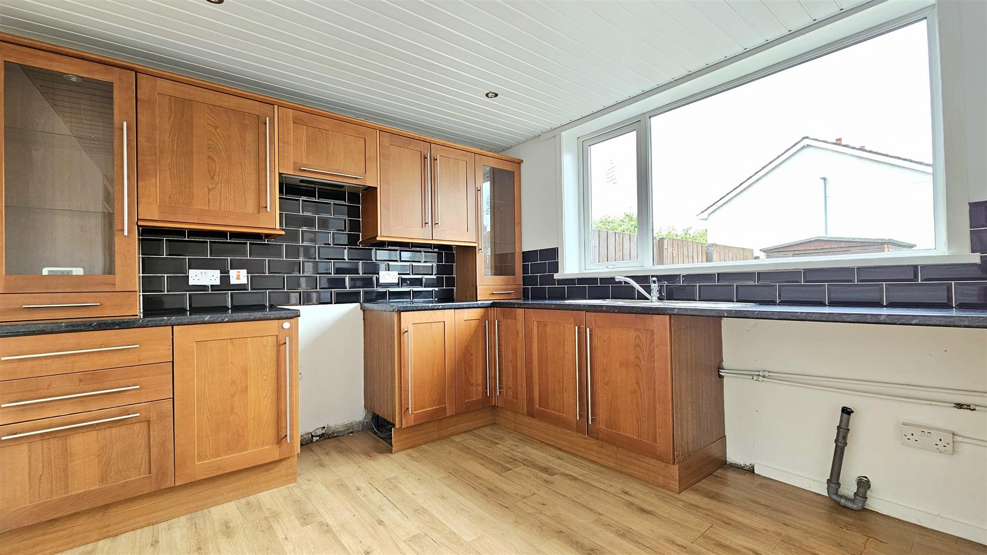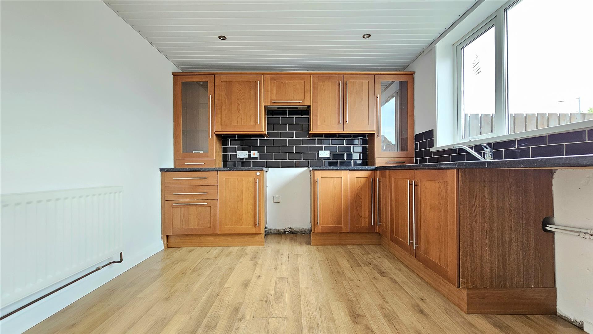 Double glazed window to rear aspect, range of walnut shaker style high and low level units with roll edge worktops, inset 1.5 bowl stainless steel sink & drainer with mixer tap over, plumbed for a washing machine, radiator, laminate wood floor, double glazed door to rear garden.