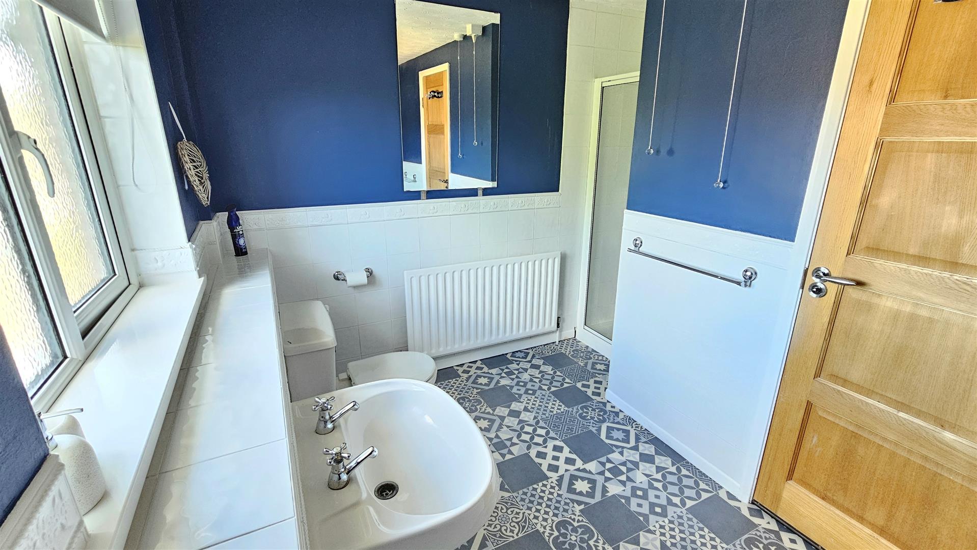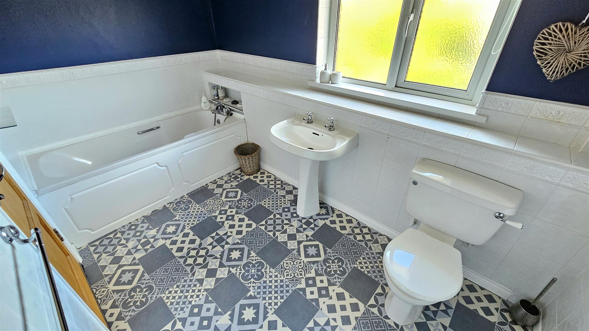 Family bathroom incorporates a white suite with a separate shower cubicle