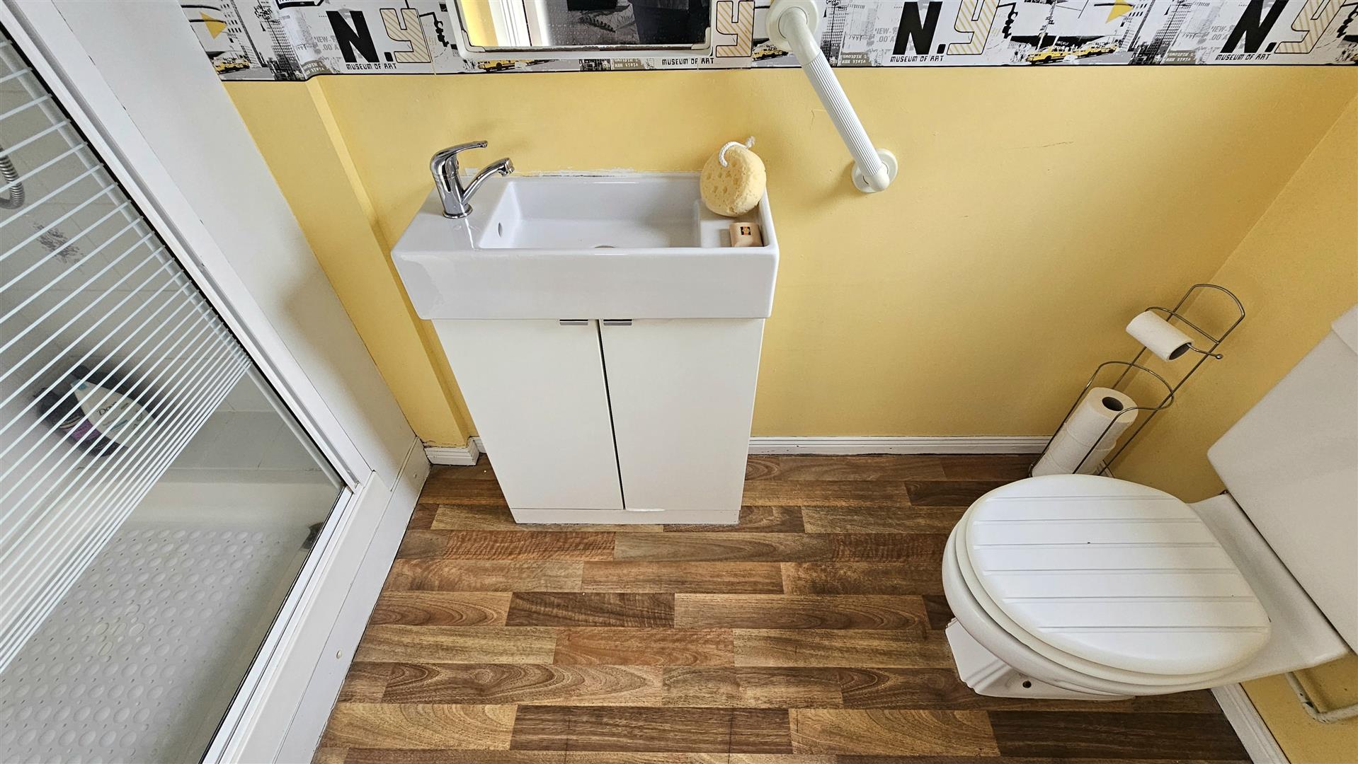 Double glazed window to side aspect, white suite comprising low flush Wc, wash hand basin set on vanity unit, shower cubicle.