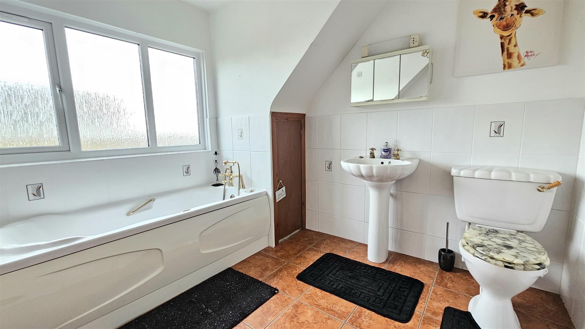 Double glazed window to rear aspect, white suite comprising low flush Wc, pedestal sink and panel enclosed bath, radiator, partly tiled walls, ceramic tiled floor.