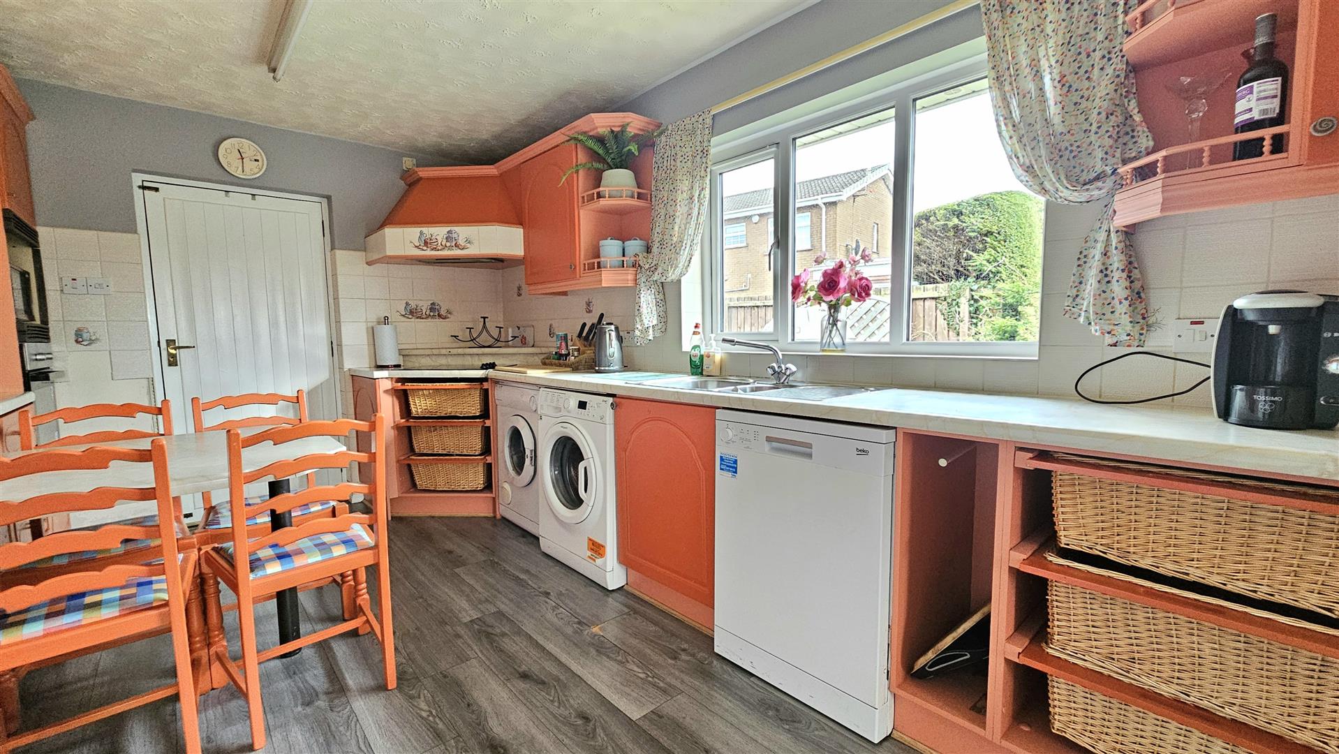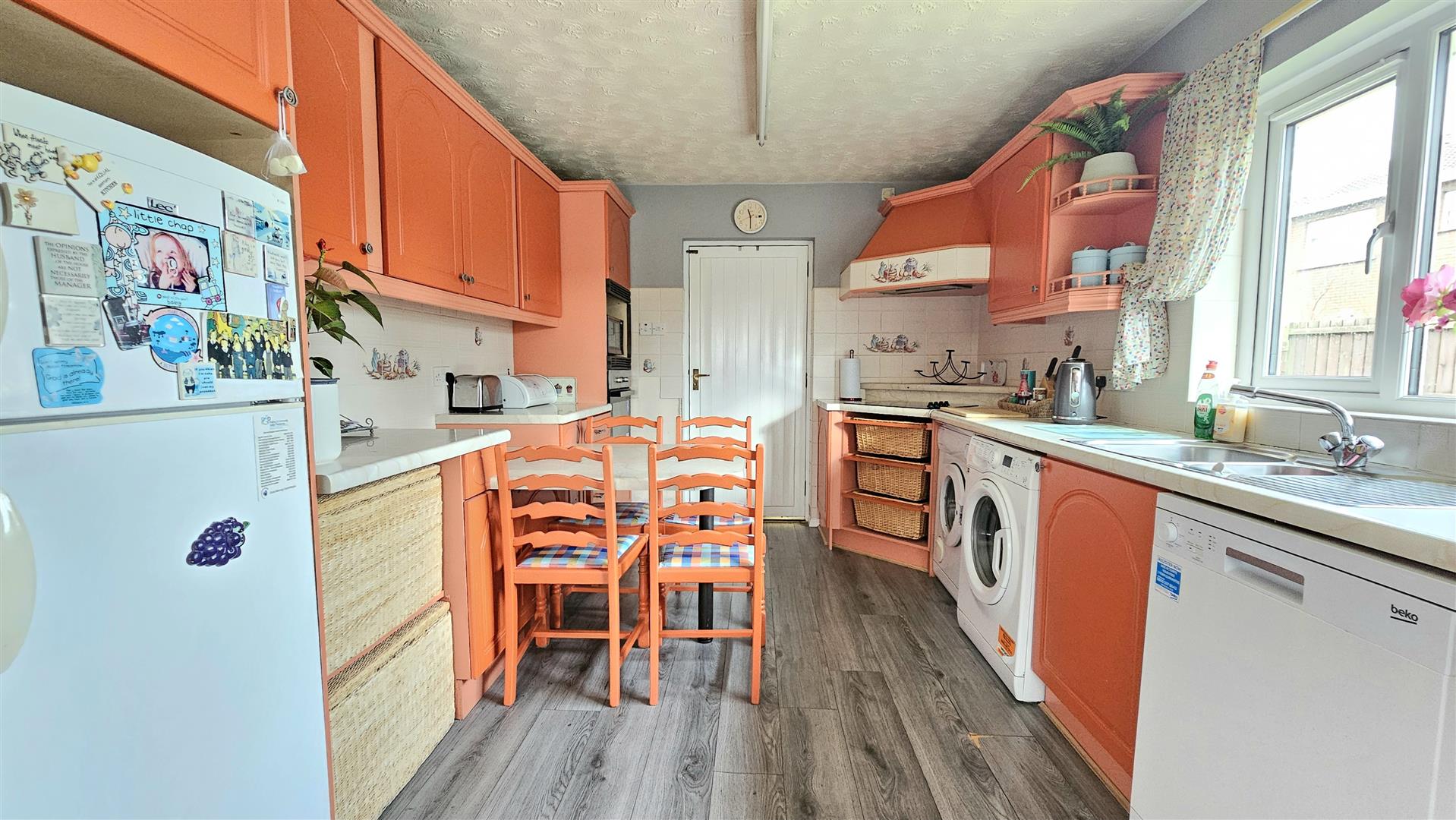 Double glazed window to rear aspect, range of high and low level units with roll edge worktops, inset 1.5 bowl, stainless steel sink and drainer with mixer tap over, built in oven and 4 ring hob with extractor fan over, breakfast bar, plumbed for washing machine, laminate wood flooring.