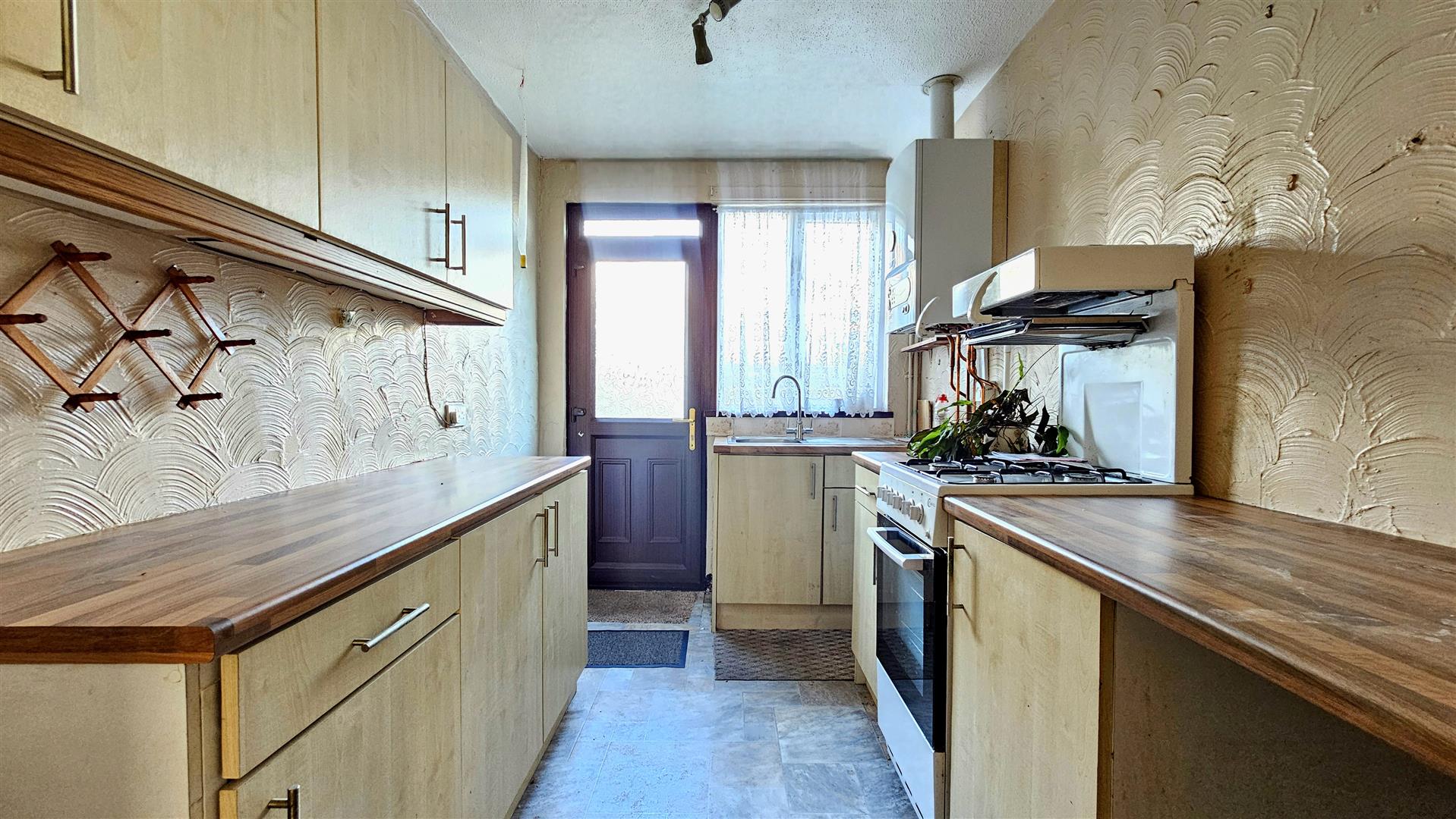 Double glazed window to rear aspect, door to rear garden, range of high and low level units with roll edge worktops, inset stainless steel sink and drainer with mixer tap over