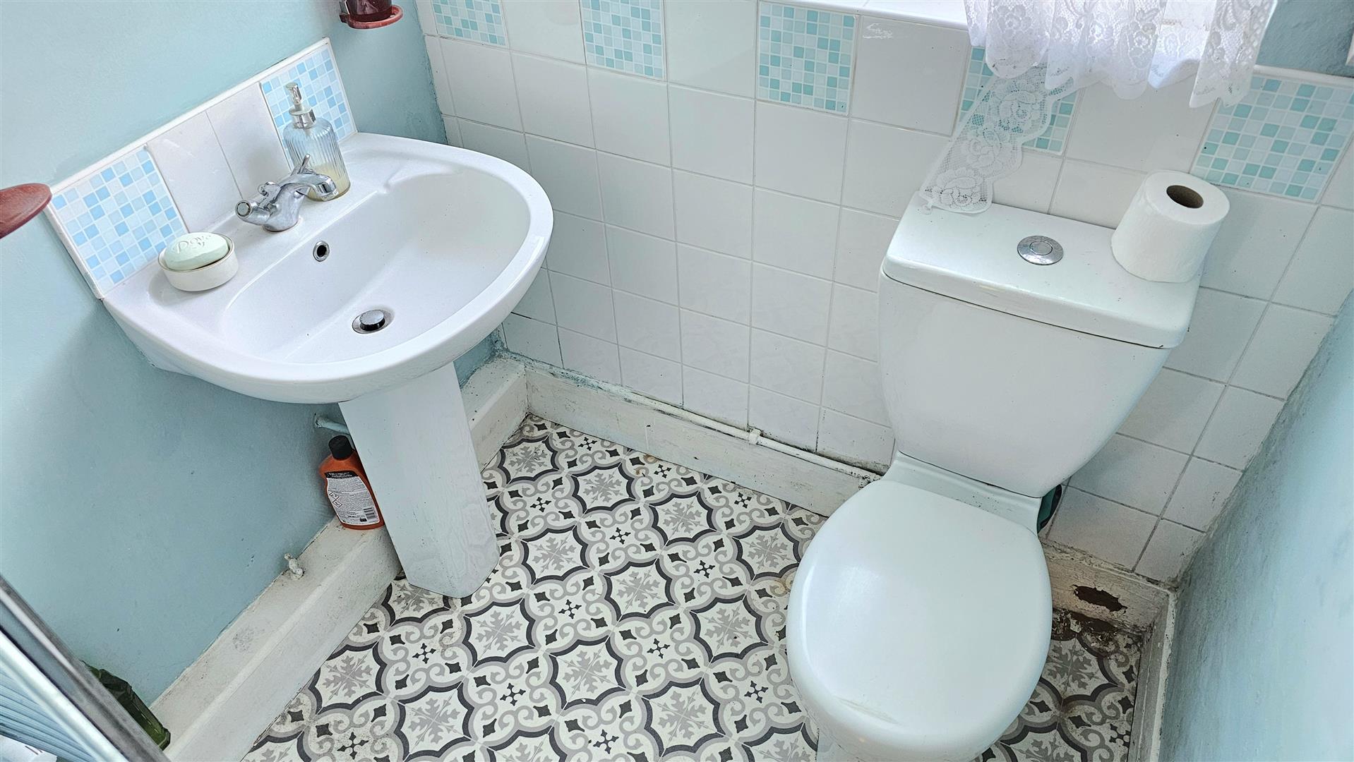 Double glazed window to rear aspect, white suite comprising low flush Wc, pedestal sink and shower cubicle