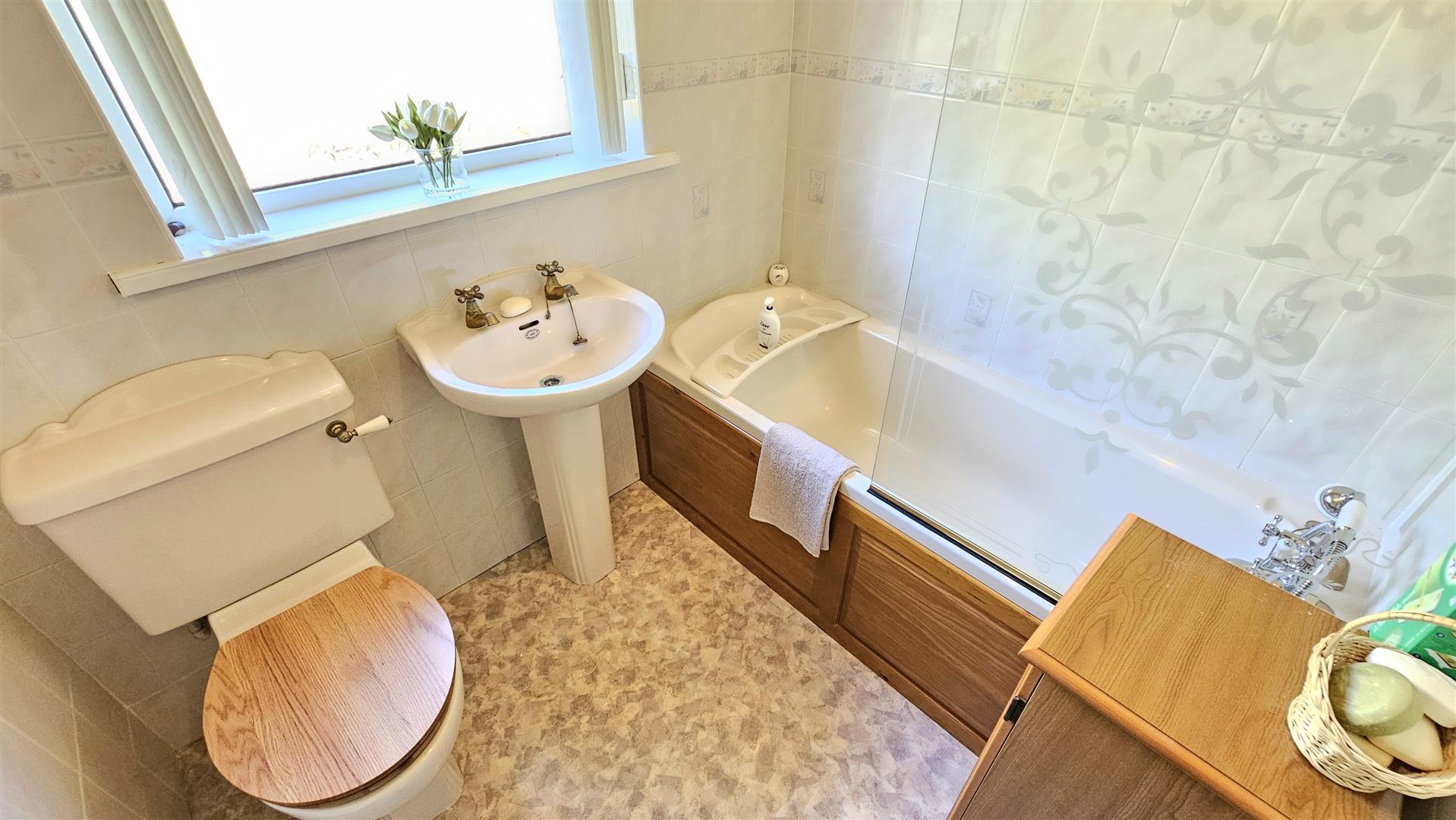 Double glazed window to rear aspect, suite comprising low flush WC, pedestal sink and enclosed bath, radiator