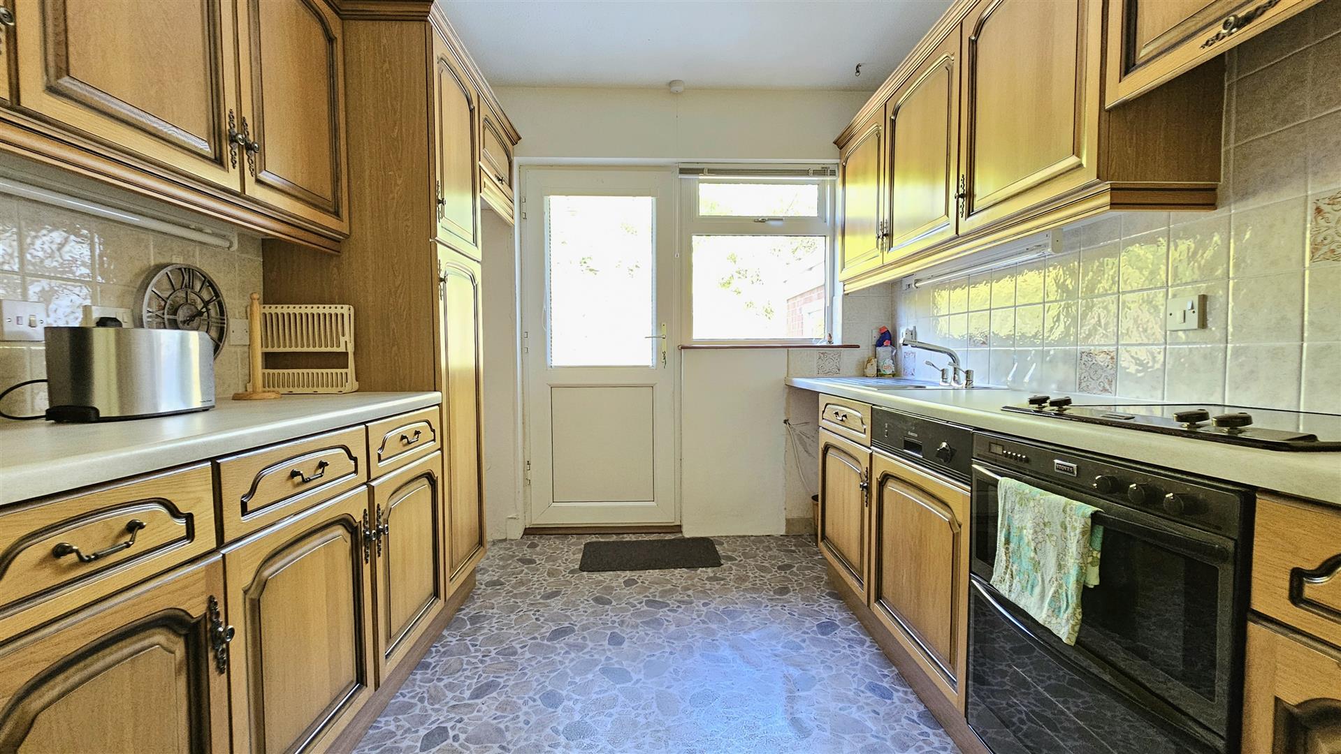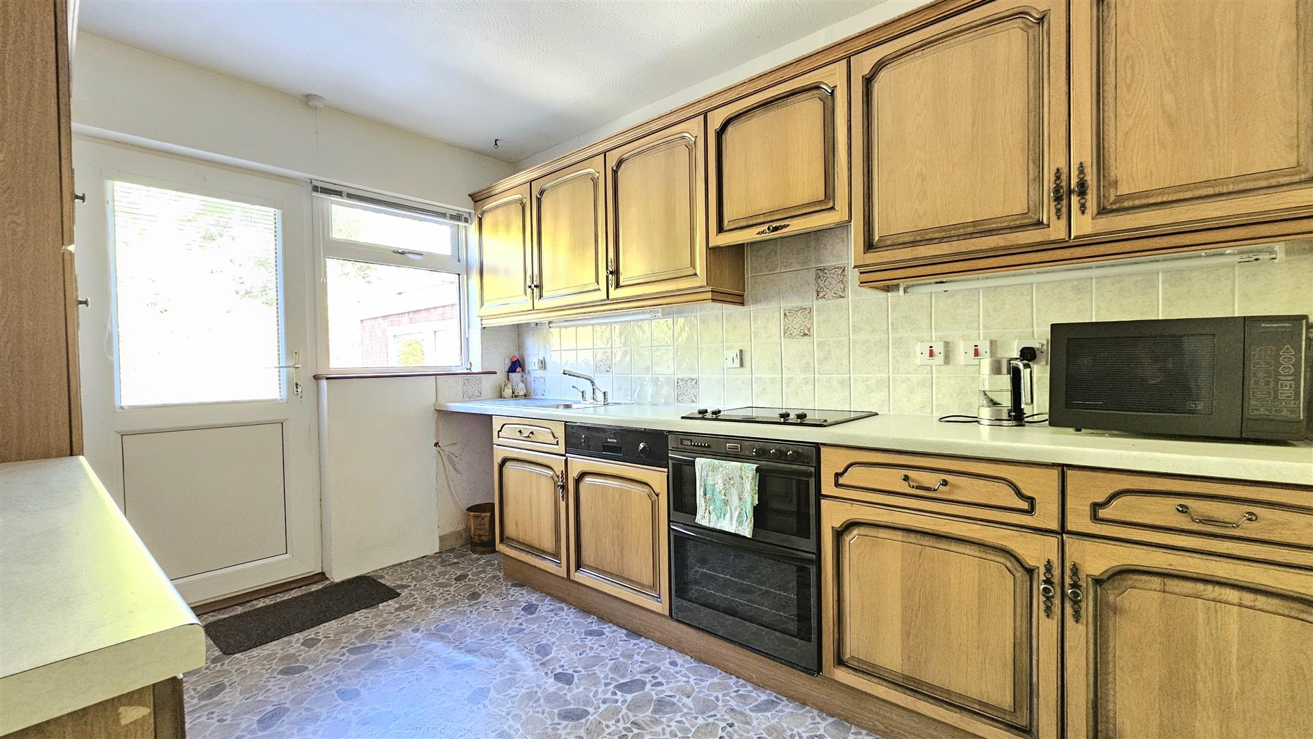 Double glazed window and door to rear aspect, range of high and low level oak style units with inset stainless steel sink and drainer with mixer tap over, built in double oven and four ring hob with extractor fan over, radiator