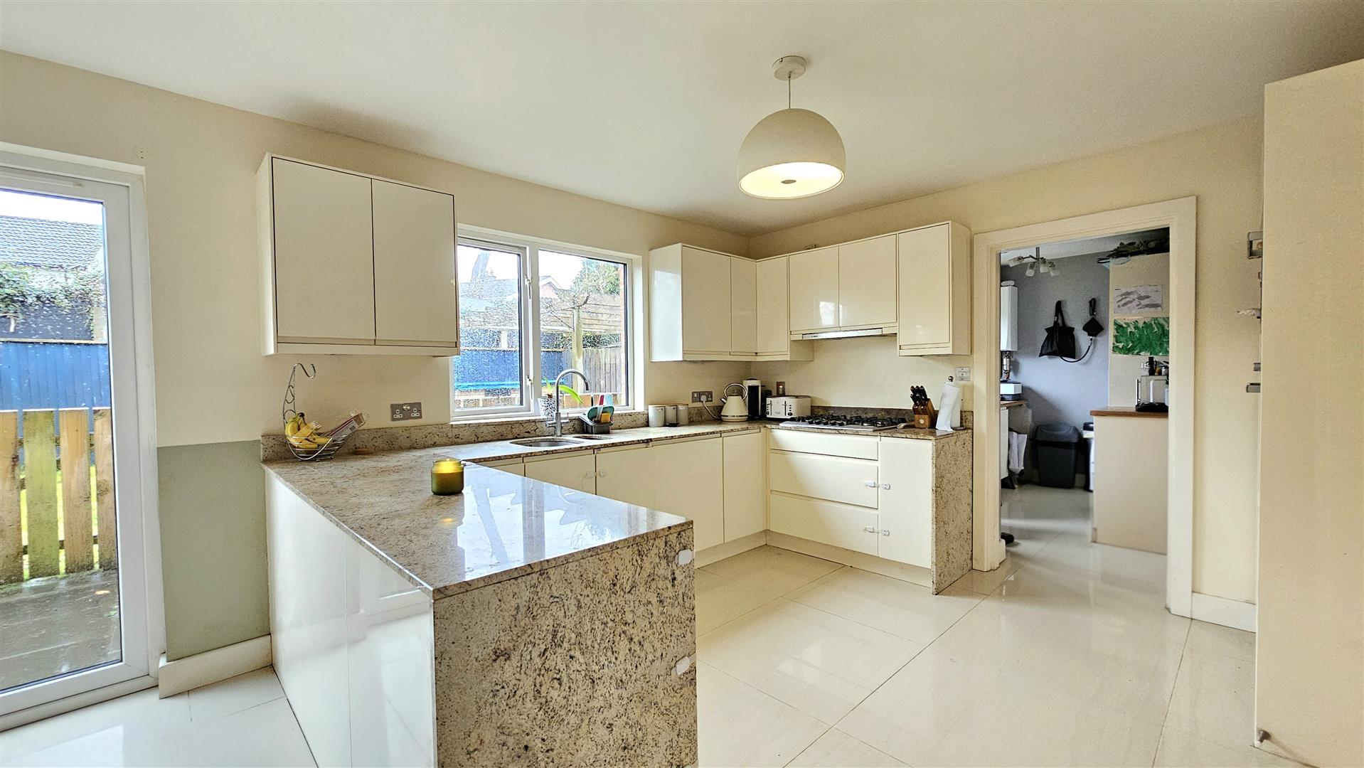 Matching tiling through entrance hall, kitchen diner and utility room