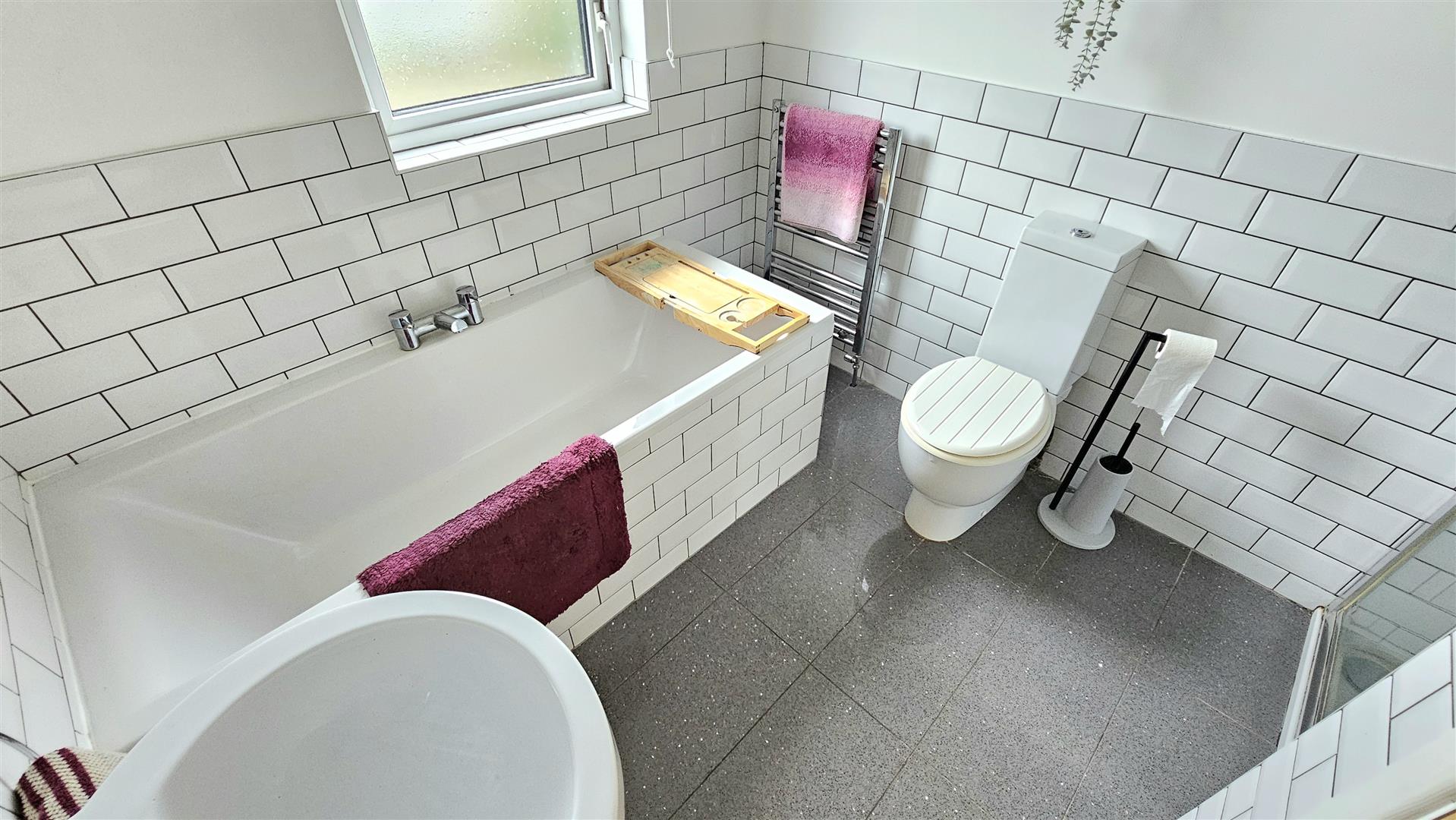 Double glazed window to rear aspect, white suite comprising low flush Wc, pedestal sink and enclosed bath, shower cubicle with power shower, porcelain tiled floor, chrome towel rail