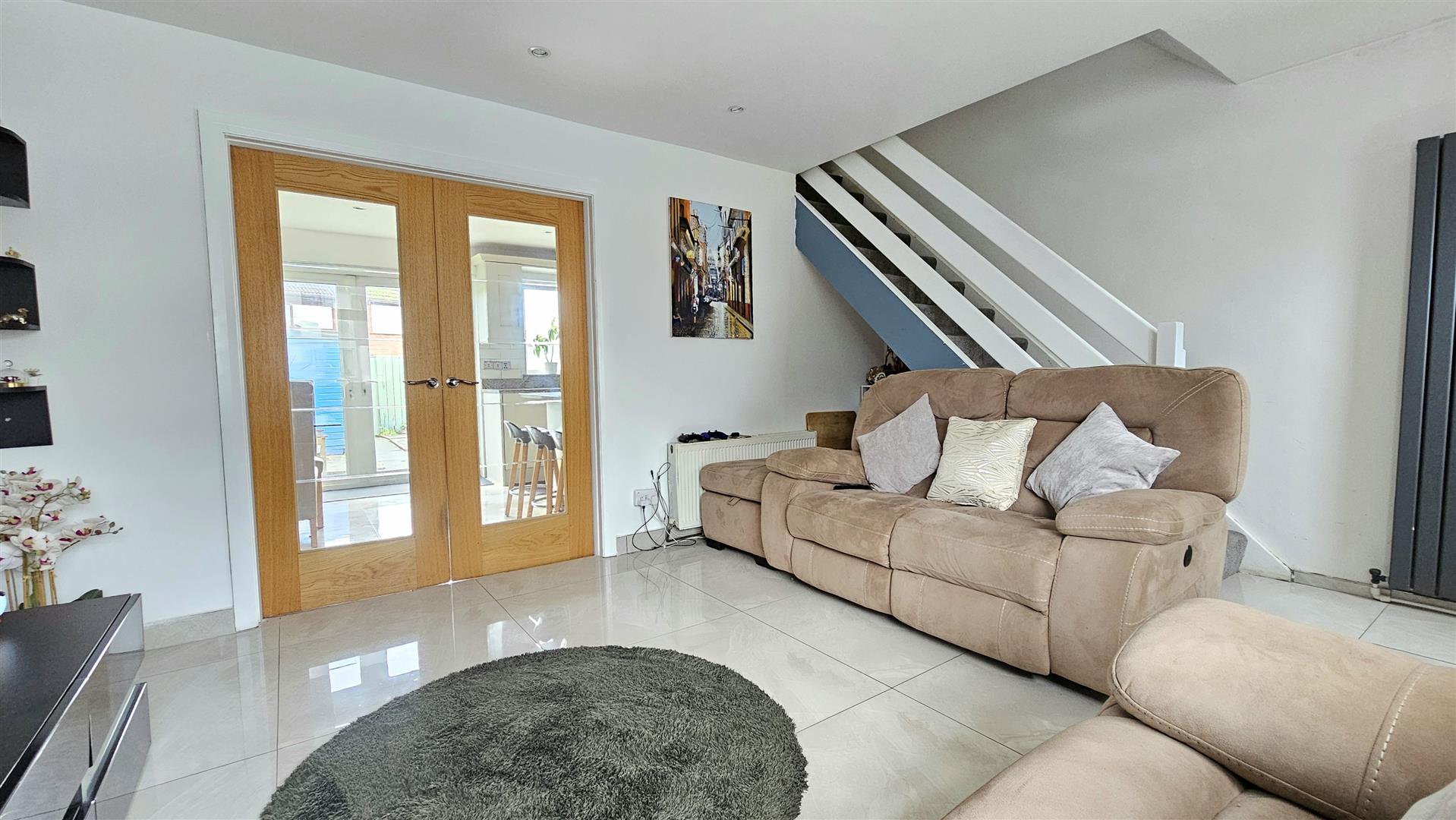 Double glazed window to front aspect, radiator, porcelain style tiled flooring, double oak doors to kitchen