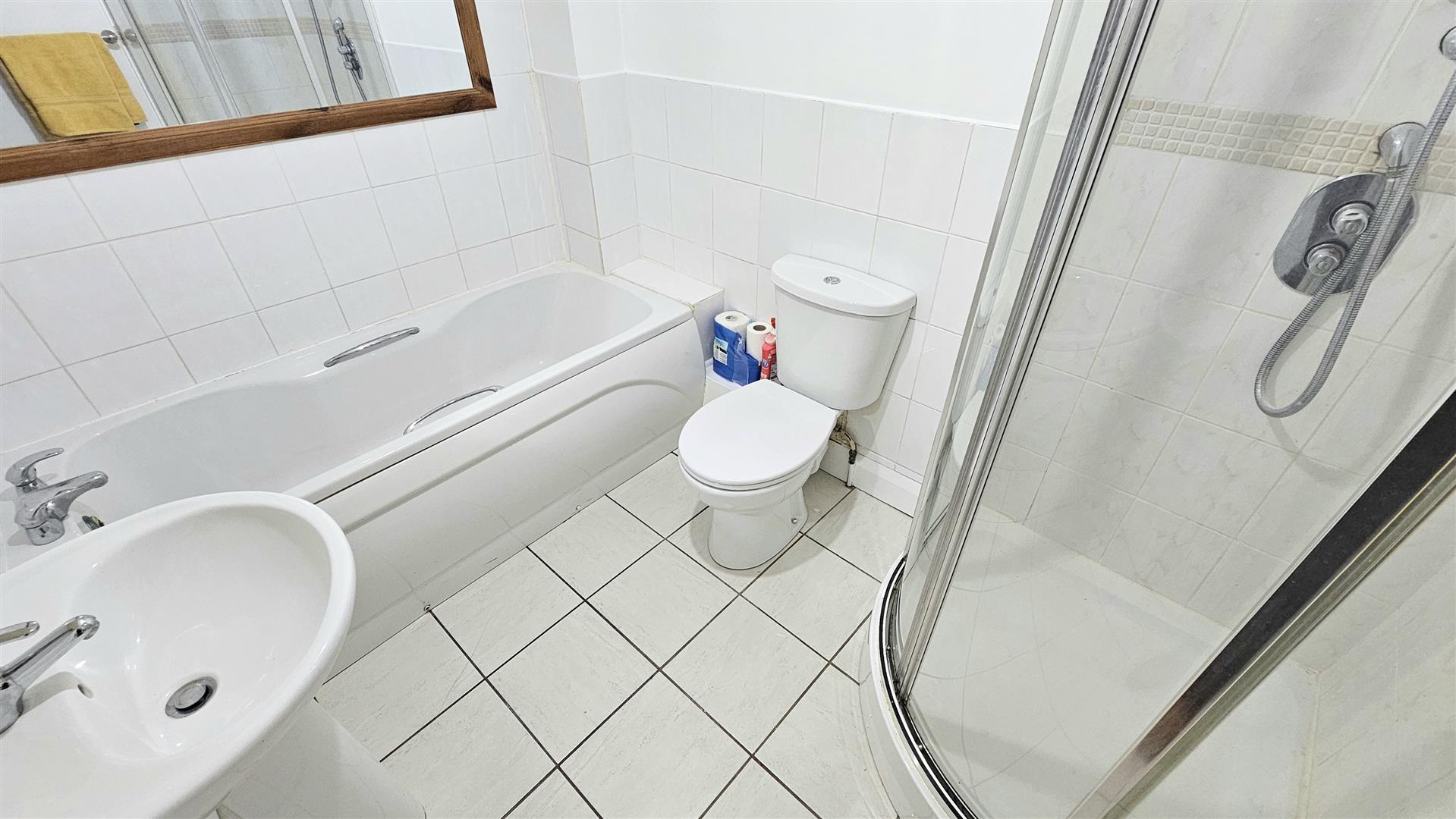 White suite comprising low flush Wc, pedestal sink and panel enclosed bath, separate shower cubicle with shower over, ceramic tiled flooring.