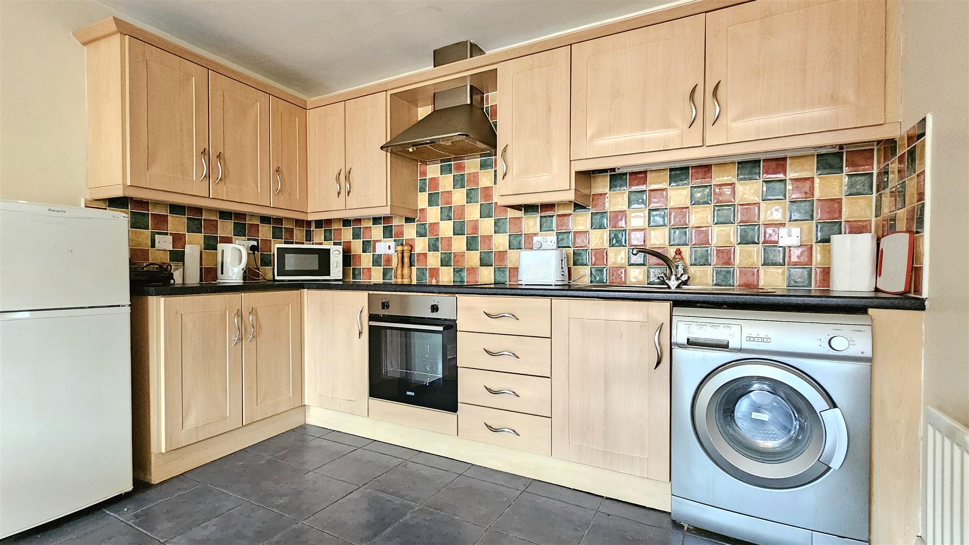 Excellent range of Beech Shaker style high and low level units with roll edge worktops, inset stainless steel sink and drainer with mixer taps over, built in stainless steel oven and four ring ceramic hob with stainless steel chimney style extractor fan over, plumbing for washing machine, radiator, ceramic tiled flooring.