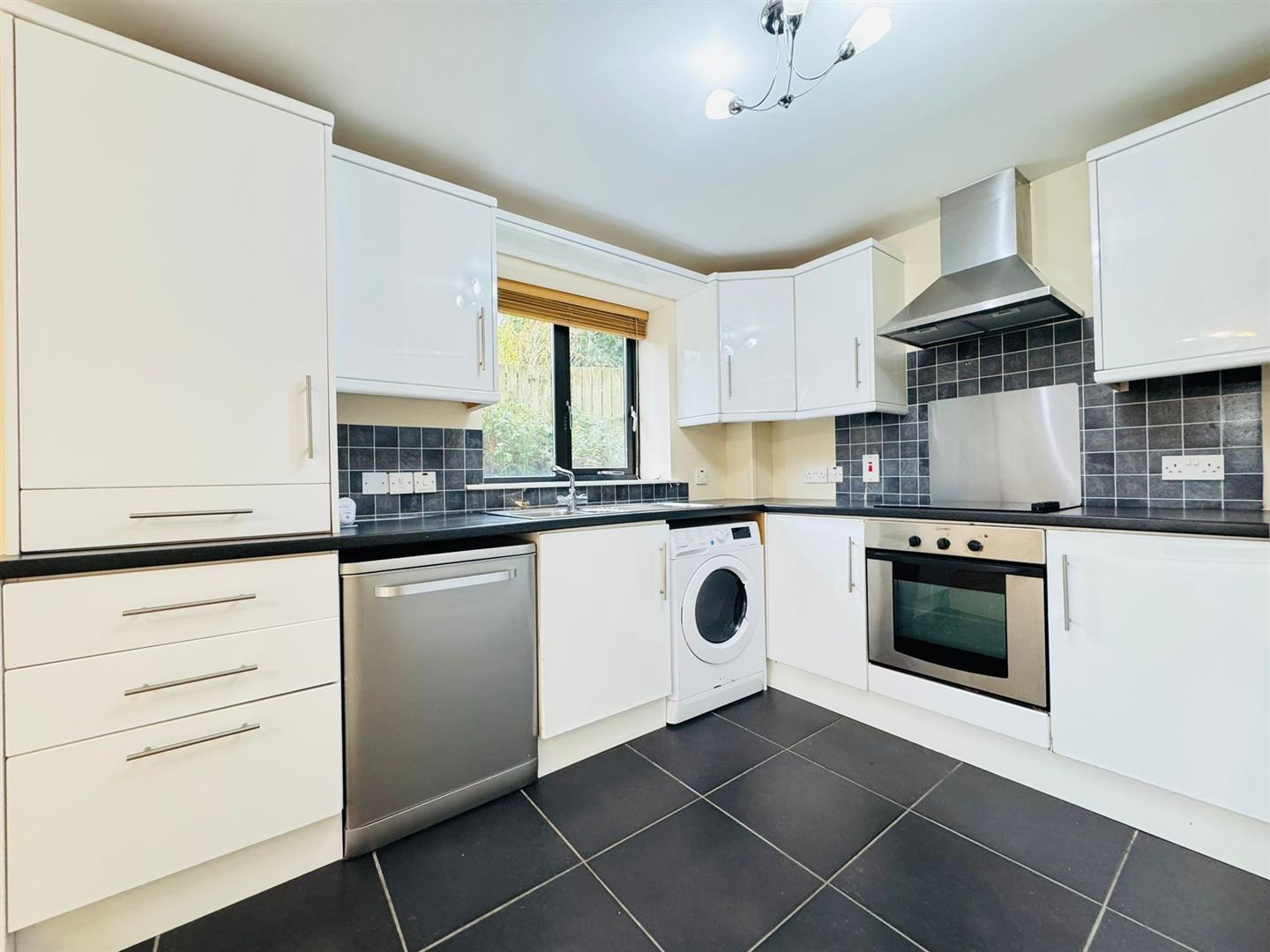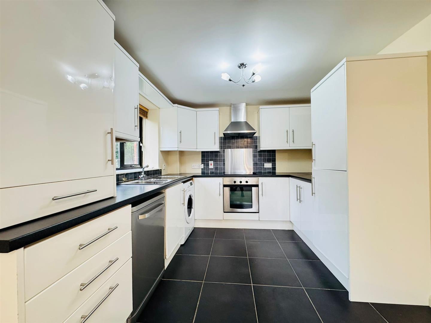 Modern range of white high gloss high and low level units, formica worktop, basin 1/2 stainless steel sink unit, built in stainless steel oven, ceramic hob, stainless steel extractor fan, integrated fridge / freezer, plumbed for washing machine and dishwasher, partly tiled walls, tiled floor in kitchen, two radiators