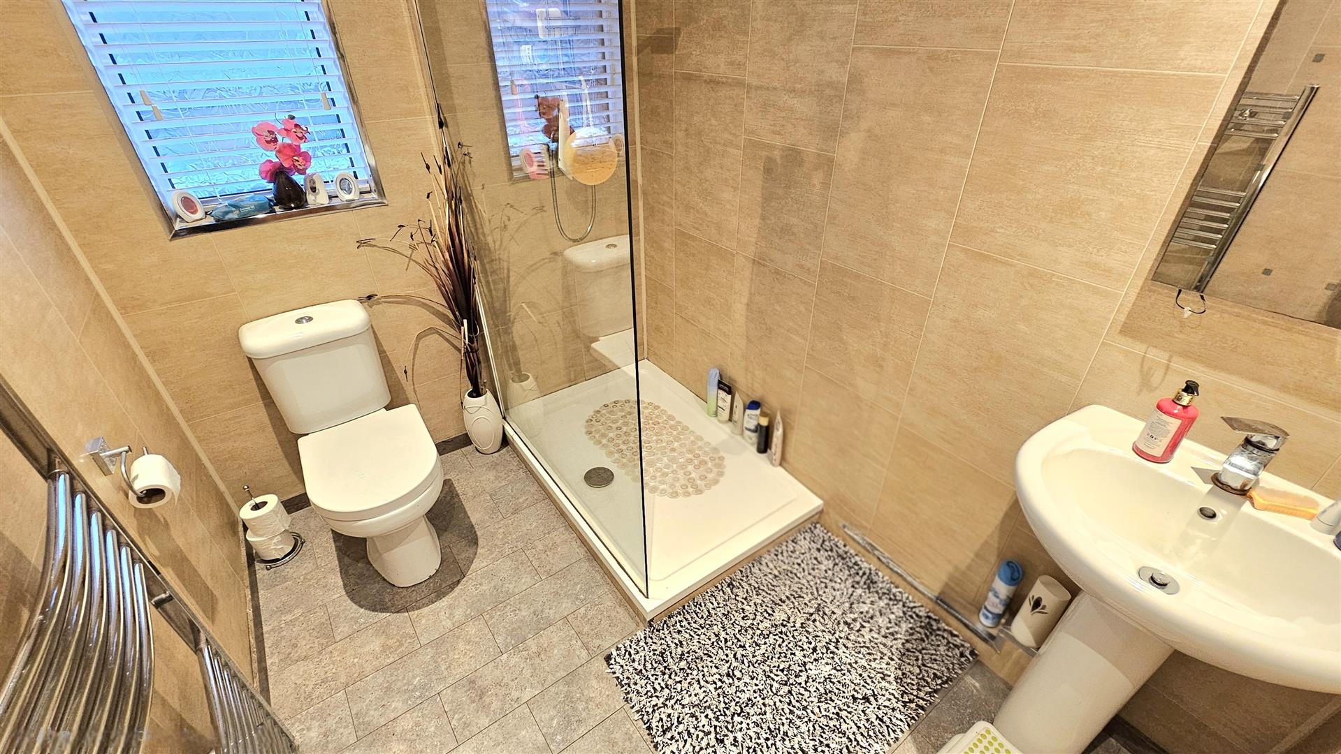 Double glazed window to side aspect, white suite comprising low flush Wc, pedestal sink, walk in shower cubicle, chrome heated towel rail, PVC panel walls