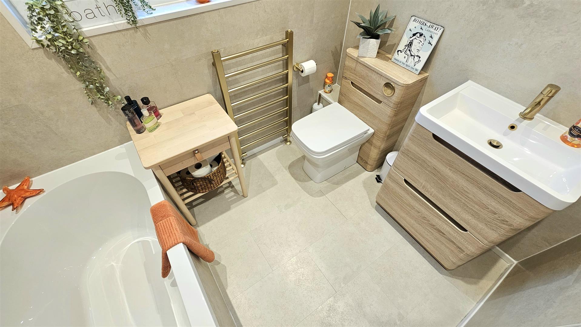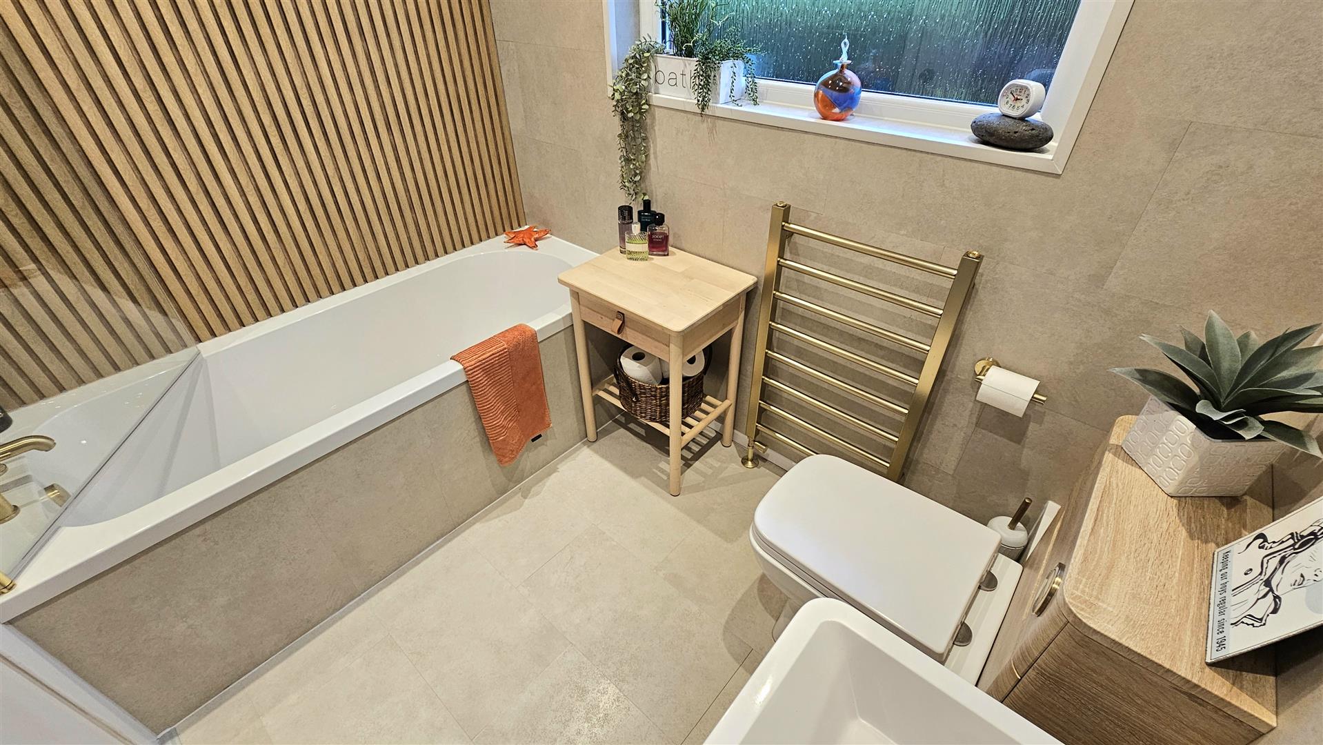 Double glazed window to rear aspect, white suite comprising low flush WC, sink with vanity unit under, enclosed bath and heated towel rail. panelled walls and feature pvc wood effect splash back