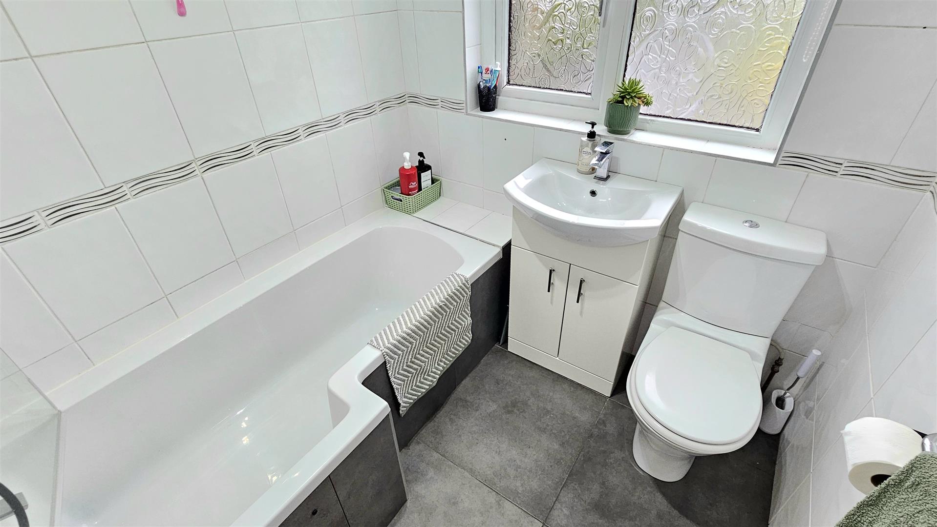 Double glazed window to rear aspect, white suite comprising low flush Wc, pedestal sink set on vanity unit, L-shaped bath with shower over, fully tiled walls and floor