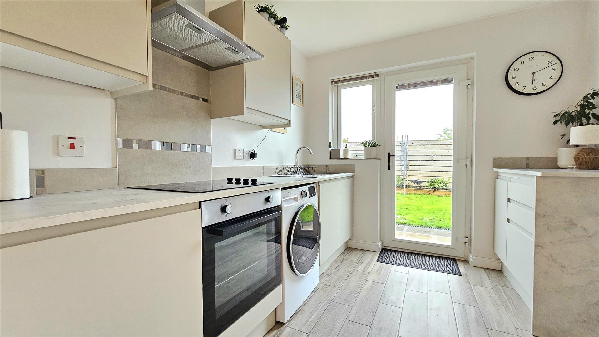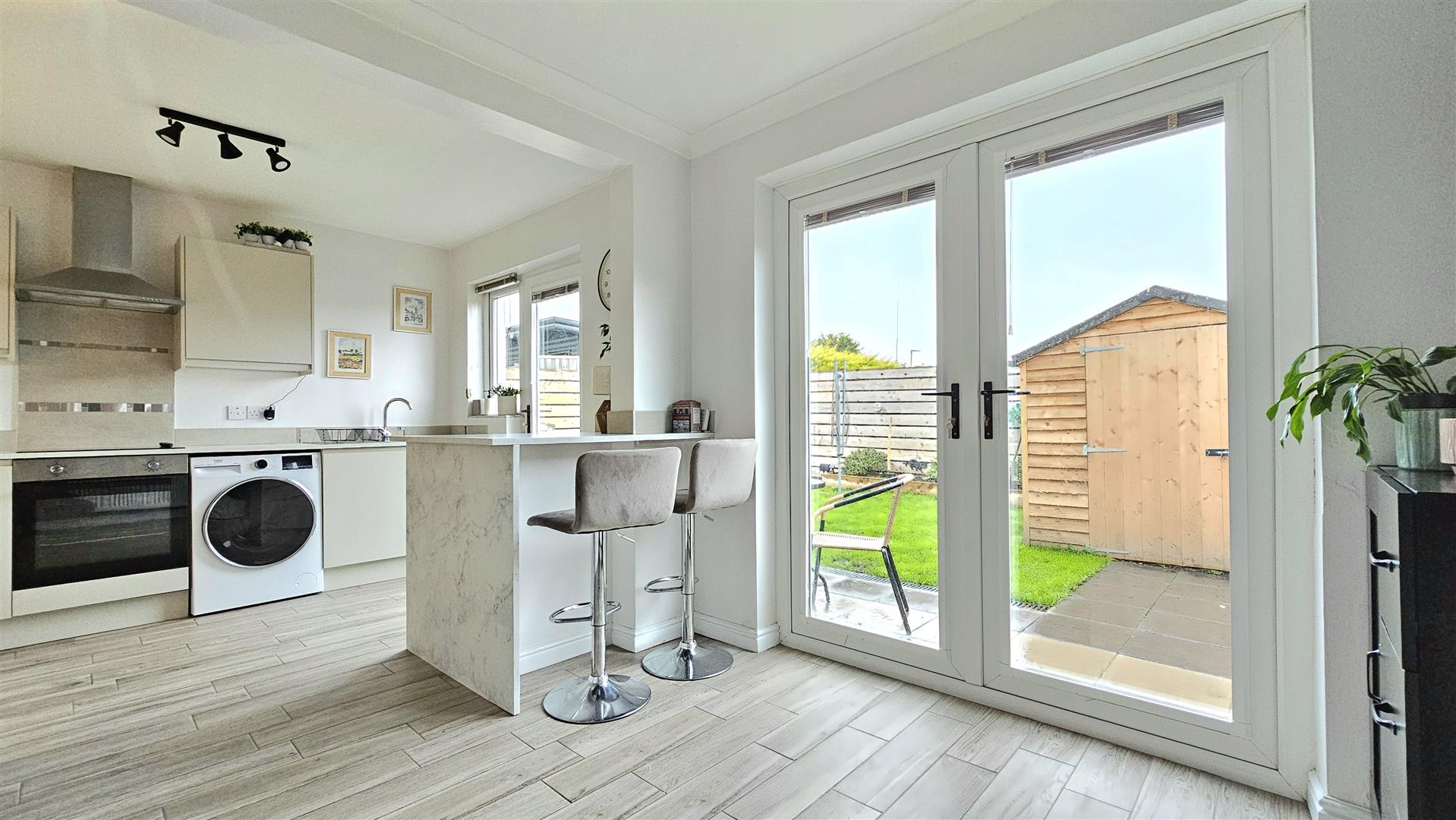 Double glazed window and floor to rear aspect, range of contemporary high and low level units with inset stainless steel sink contrasting worktops, built in stainless steel oven and four ring hob with extractor fan over, breakfast bar, radiator, tiled flooring, double doors to rear garden