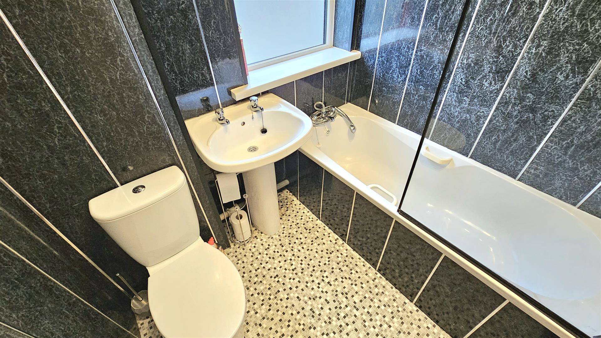 Double glazed window to rear aspect, white suite comprising low flush Wc, pedestal sink, enclosed bath with electric shower over, PVC panel walls, chrome heated towel rail