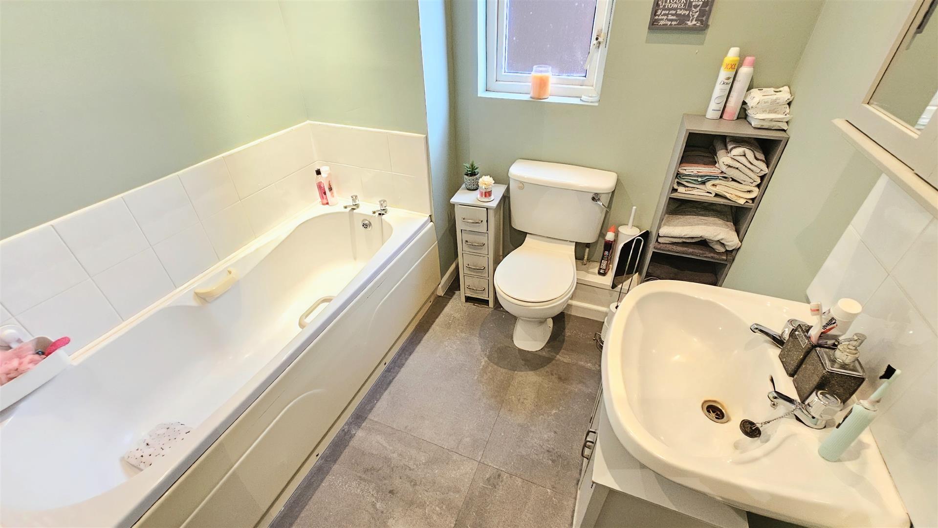Double glazed window to side aspect, white suite comprising low flush Wc, pedestal sink, enclosed bath, radiator